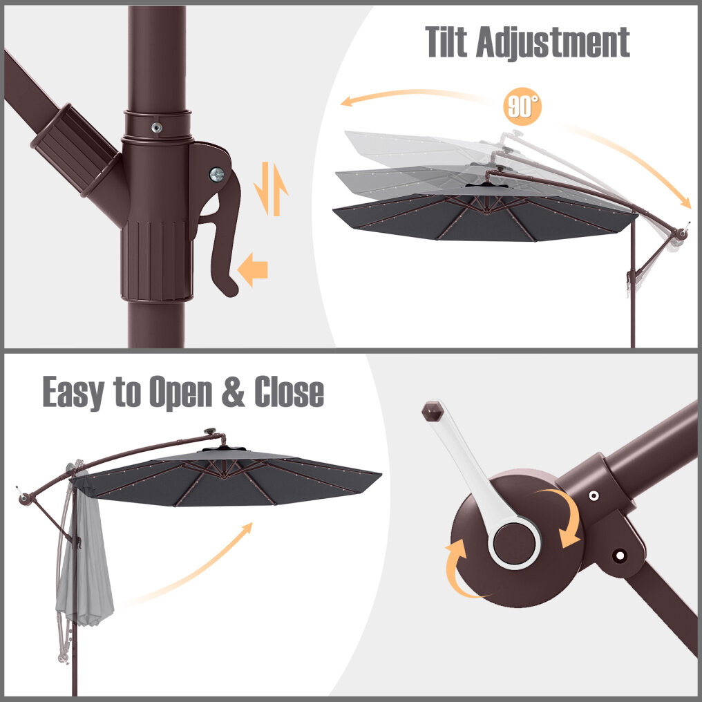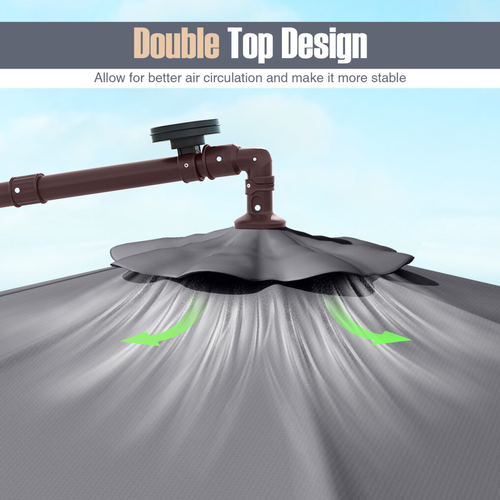 Excellent Canopy: The canopy of this cantilever umbrella is made of 180 gsm polyester fabric which features great water protection and fade resistance, enables you to stay calm on rainy days and guarantees no colour loss for a long time. Meanwhile, the air vent design can facilitate airflow to keep you comfortable on hot summer days.