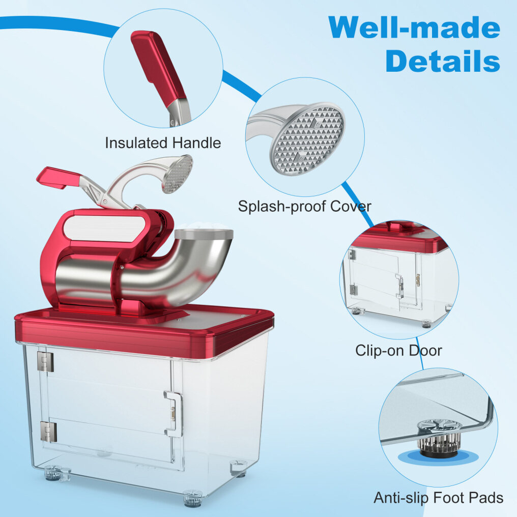 ● Selected Materials: This commercial ice crusher is made of premium stainless steel and a thickened one-piece injection-molded PC container, which not only ensures a longer lifespan but also slows down the shaved ice melt. The anti-slip rubber foot pads keep it stable on the countertop.
