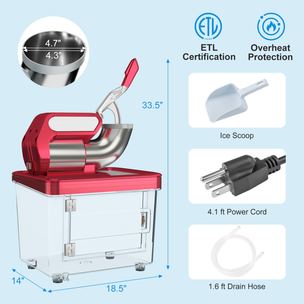 ● Safe and Simple to Operate: The waterproof switch allows you to operate this ETL-approved snow cone maker easily and safely. It will stop running when the plunger is pulled out of the hopper for security. Besides, the overheat protection makes it automatically shut down as well if the inner components reach 266℉.