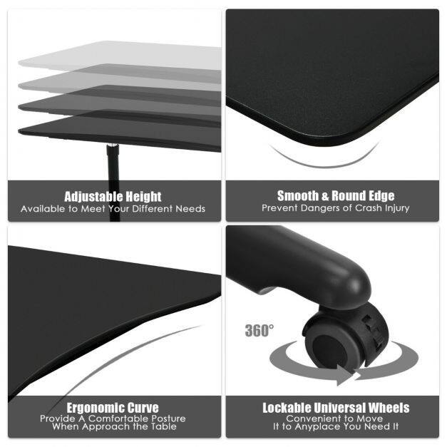 This standing desk features a powerful gas-lifting system which can easily adjust the desk height from 70 to 106.5cm to meet your needs of various working postures. The bent posture and long-term typing can cause waist fatigue and possible pain. With the height adjustable computer desk, you can say goodbye to the fatigue caused by sedentary work and end the day feeling energized. Made of high-quality MDF and sturdy steel frame, the desk is pretty stable and durable. The spacious desktop with round corners and ergonomic curve provides great comfort and safety. Moreover, equipped with 4 universal casters, 2 of them with lockable design for fixing, the desk can be moved to anywhere easily.