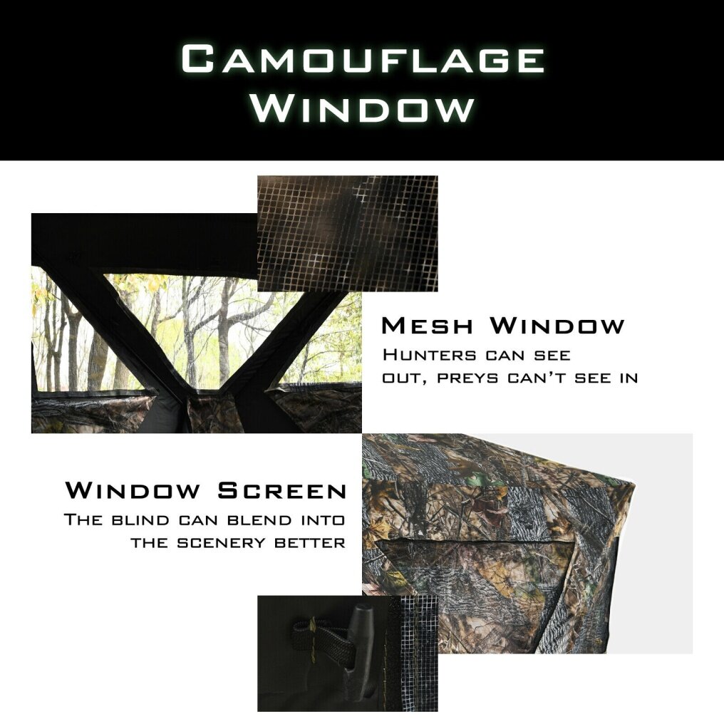 Maximum Field of View: This hunting blind has large detachable mesh windows on 3 sides of the blind, providing you a wide view to watching your prey. Each window has a non-transparent window screen inside the blind, helping you not to be seen by prey. Detach the mesh window and you can shoot freely.