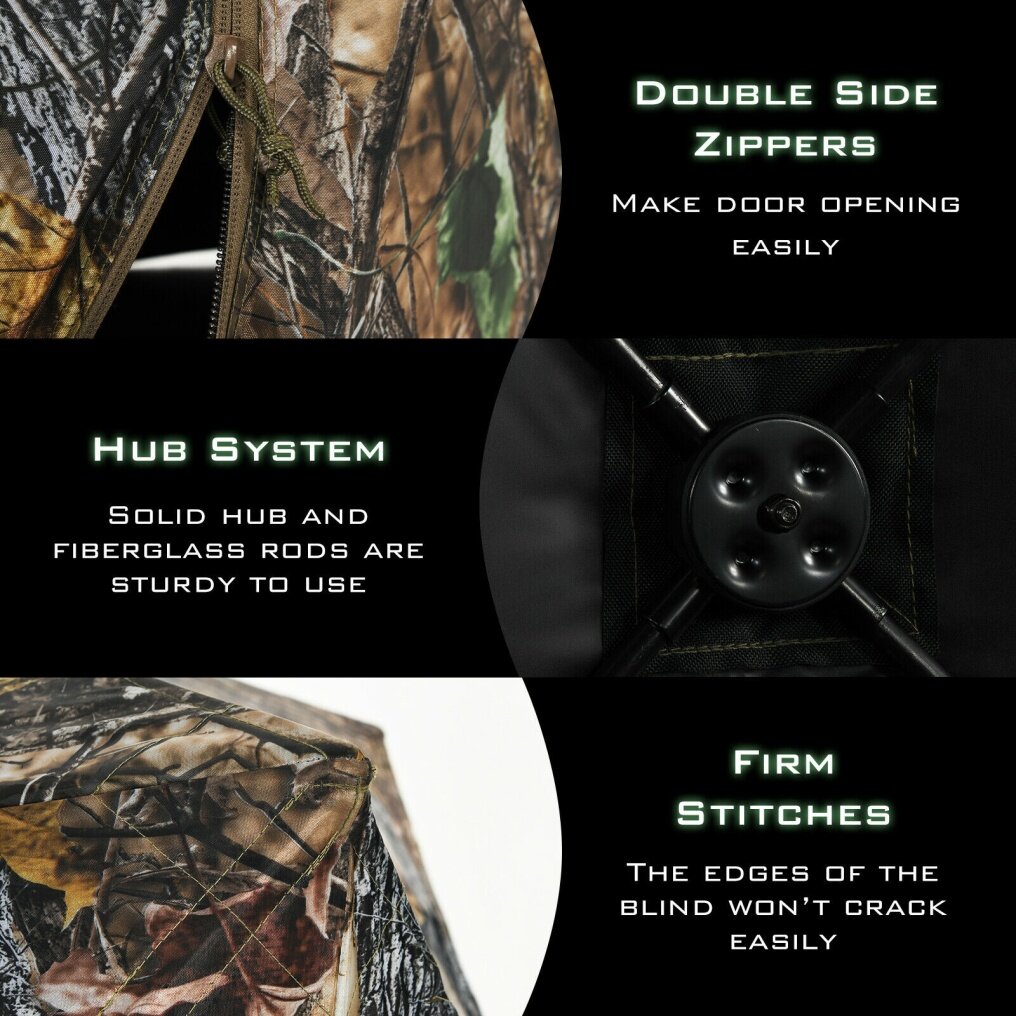 Stable & Durable Structure: The frame of the hunting blind is made of robust fiberglass rods, which are lightweight yet robust enough to support the tent. Covered by thick polyester fabric, the blind surface is wear-resistant and waterproof to withstand outdoor weather and scratches from branches. But we still recommend you hunt another day if the weather is nasty.