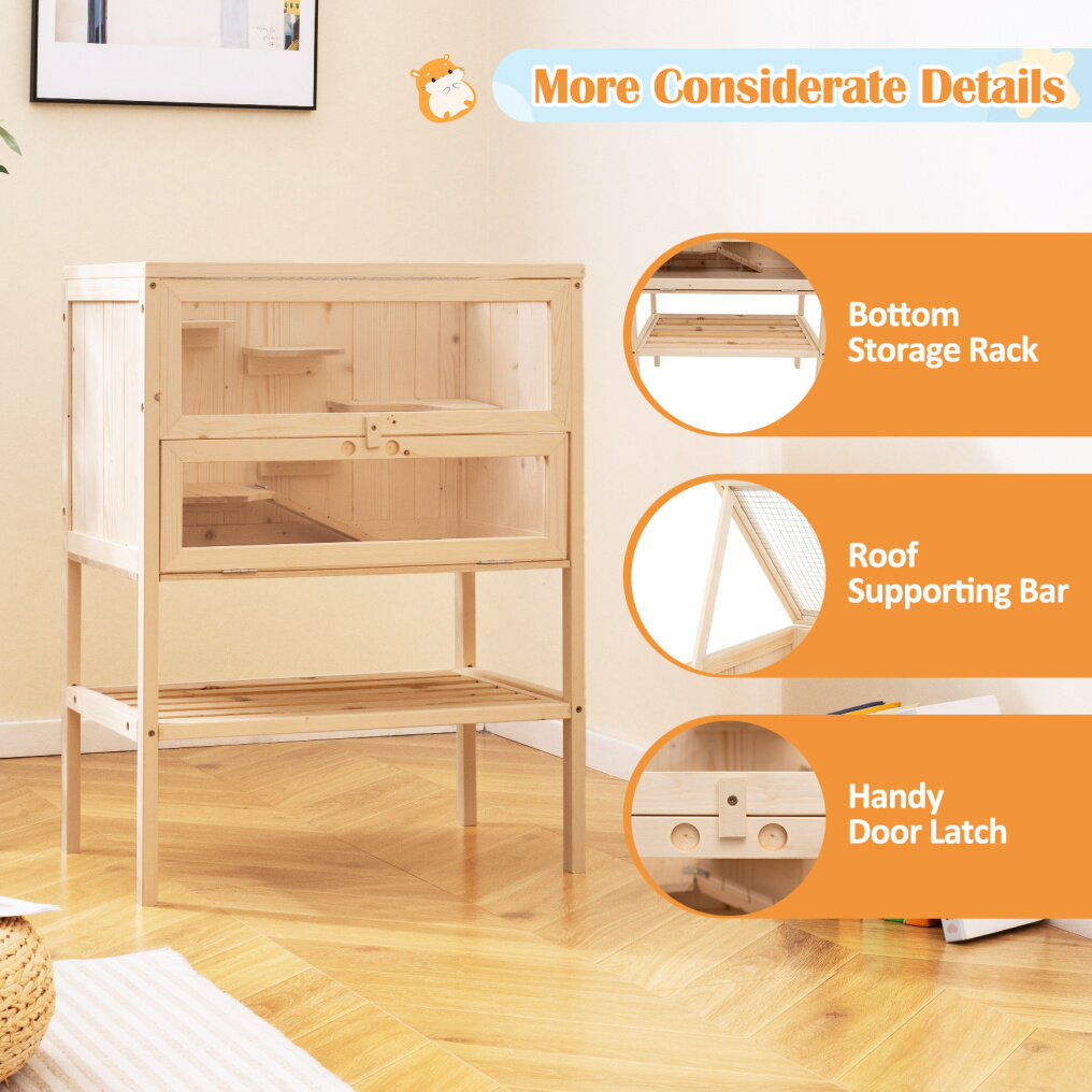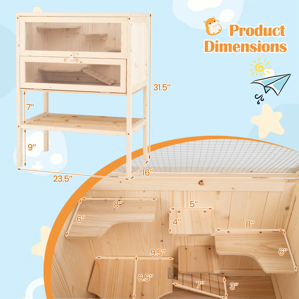 【Compact Size & Extra Storage】With overall dimensions of 60cm x 40cm x 80cm (L x W x H), this hamster habitat play area doesn't take up much space and can be easily placed against a wall. In addition, the bottom storage rack provides extra space for pet supplies, helping to keep your living space organized and clean.