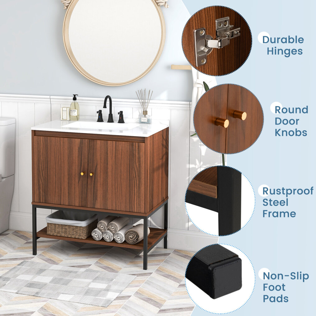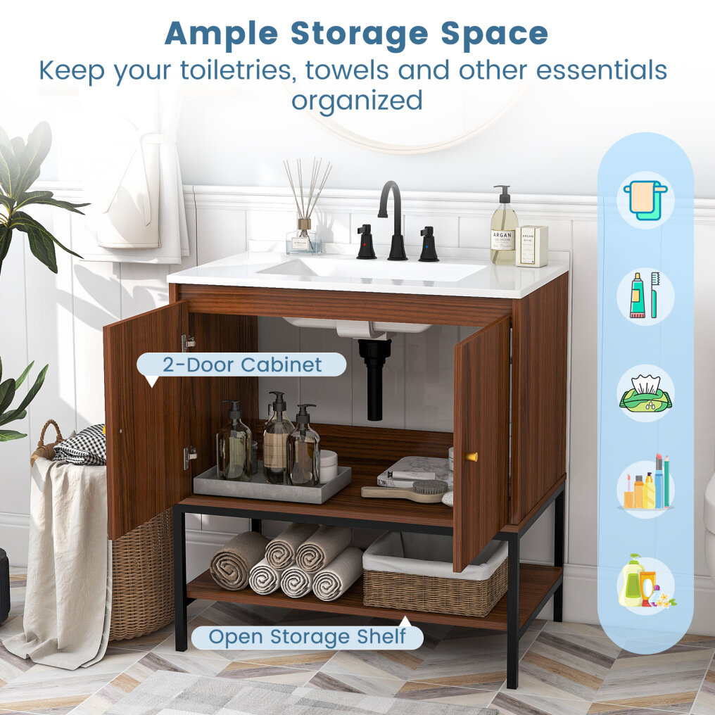● Ample Storage Space: This bathroom vanity sink combo set offers ample storage with its 2-door cabinet and open storage shelf. It can help you keep your toiletries, towels and other essentials organized, optimizing space efficiency and meeting your various storage needs.