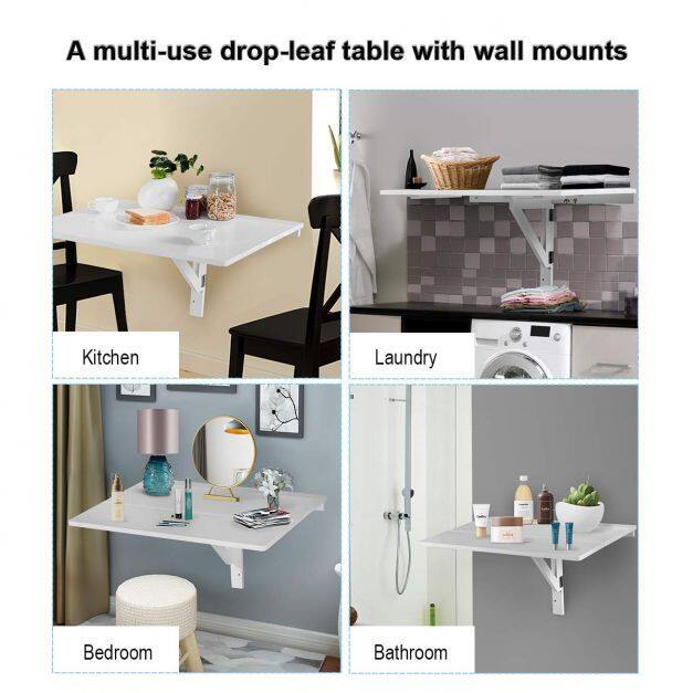 This wall mounted drop-leaf table is designed with space efficiency in mind to provide a functional table area without using extra space.