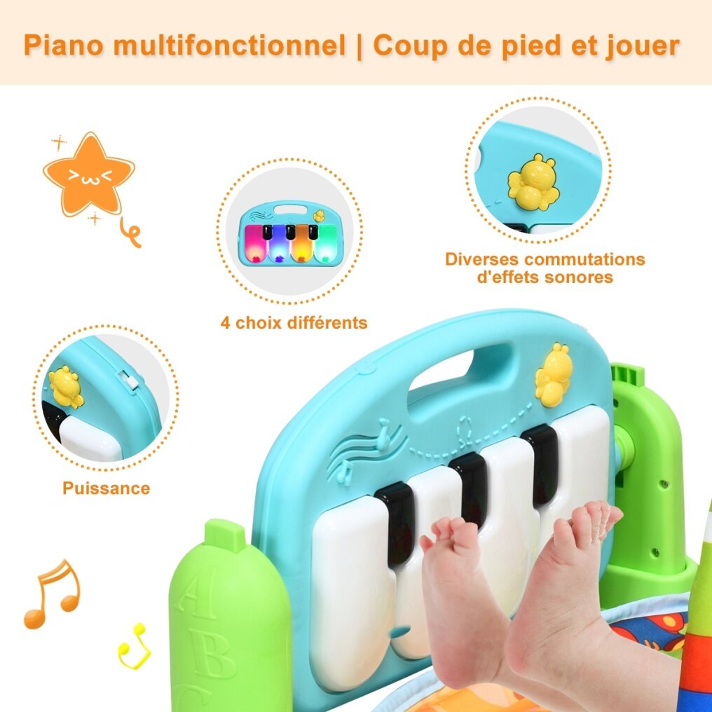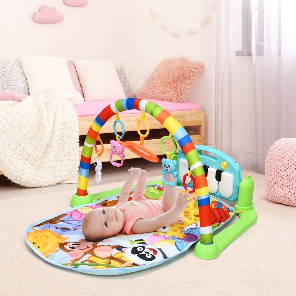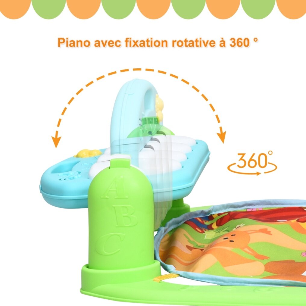 ● Multifunctional and Adjustable Piano: This baby play mat is equipped with a multifunctional piano that can be switched with various modes, such as melodies, notes and sound effects. With 360° adjustable design, piano can be fixed at any angle by pressing the button on both sides, which is ideal for baby to play, kick or pedal.