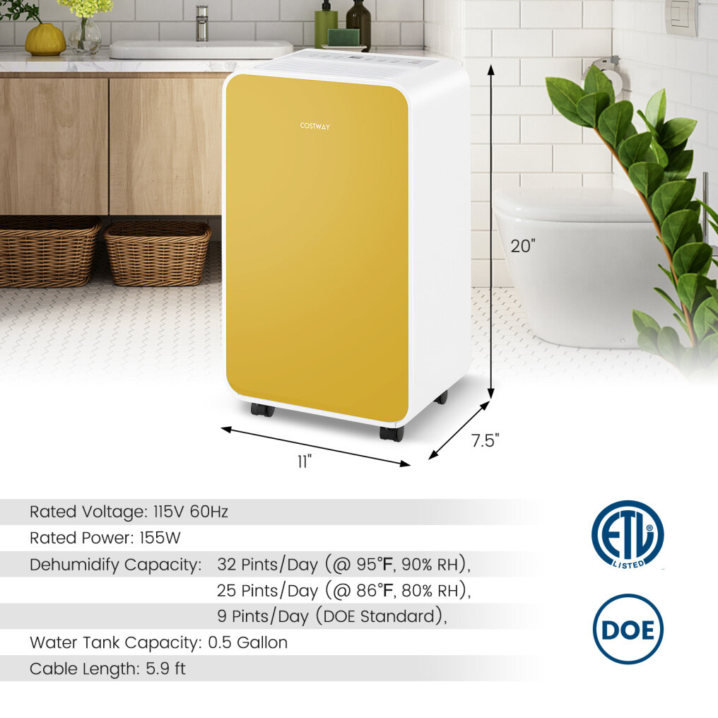 32 Pints/Day Portable Quiet Dehumidifier for Rooms up to 2500 Sq. Ft-Yellow