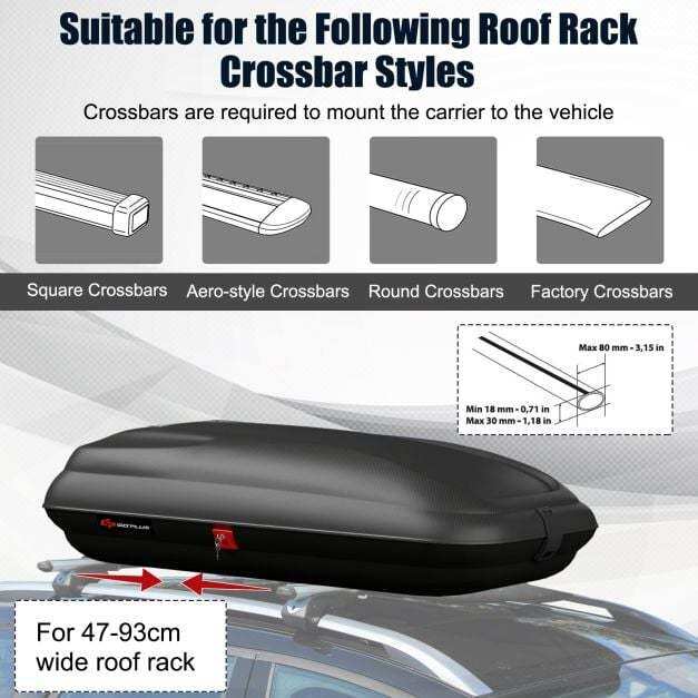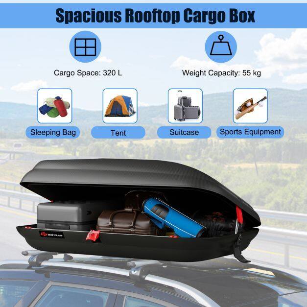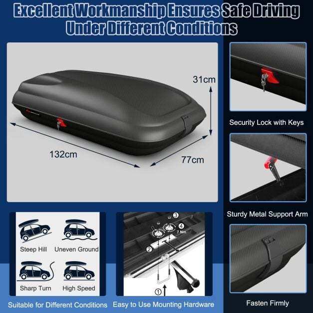 ● Extra Storage Space: With a spacious 8.83 cubic feet storage space, this rooftop cargo carrier is able to accommodate a variety of outing items for you, such as sleeping bags, tents, suitcases, skiing boards, etc.
