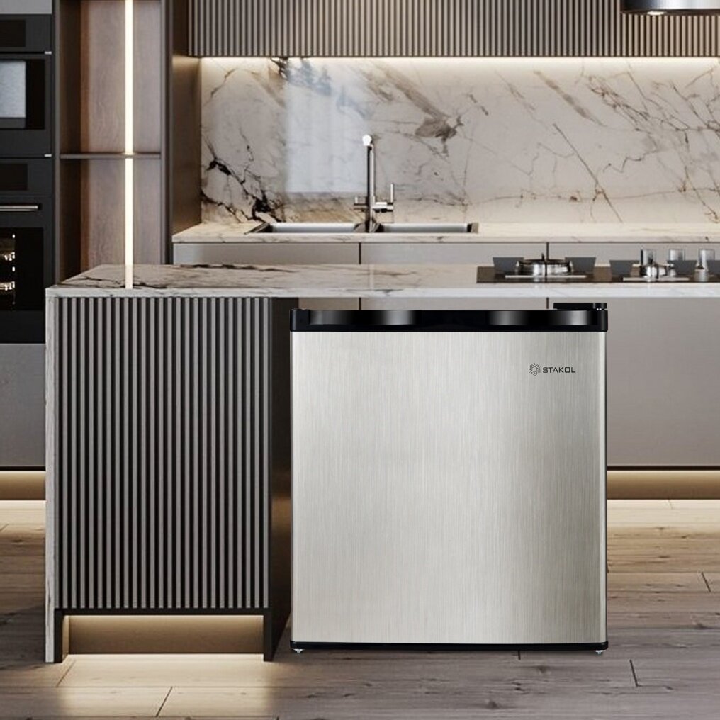 This stainless steel freezer fits in any small space where cold storage is needed. This space-saving compact upright freezer is designed with a flush back, allowing it to fit cleanly against the wall or into corners. The adjustable leveling leg can fit unique spaces and store all your go-to foods in an accessible wire pullout shelf. The adjustable thermostat can meet all your needs while keep your energy costs down.
