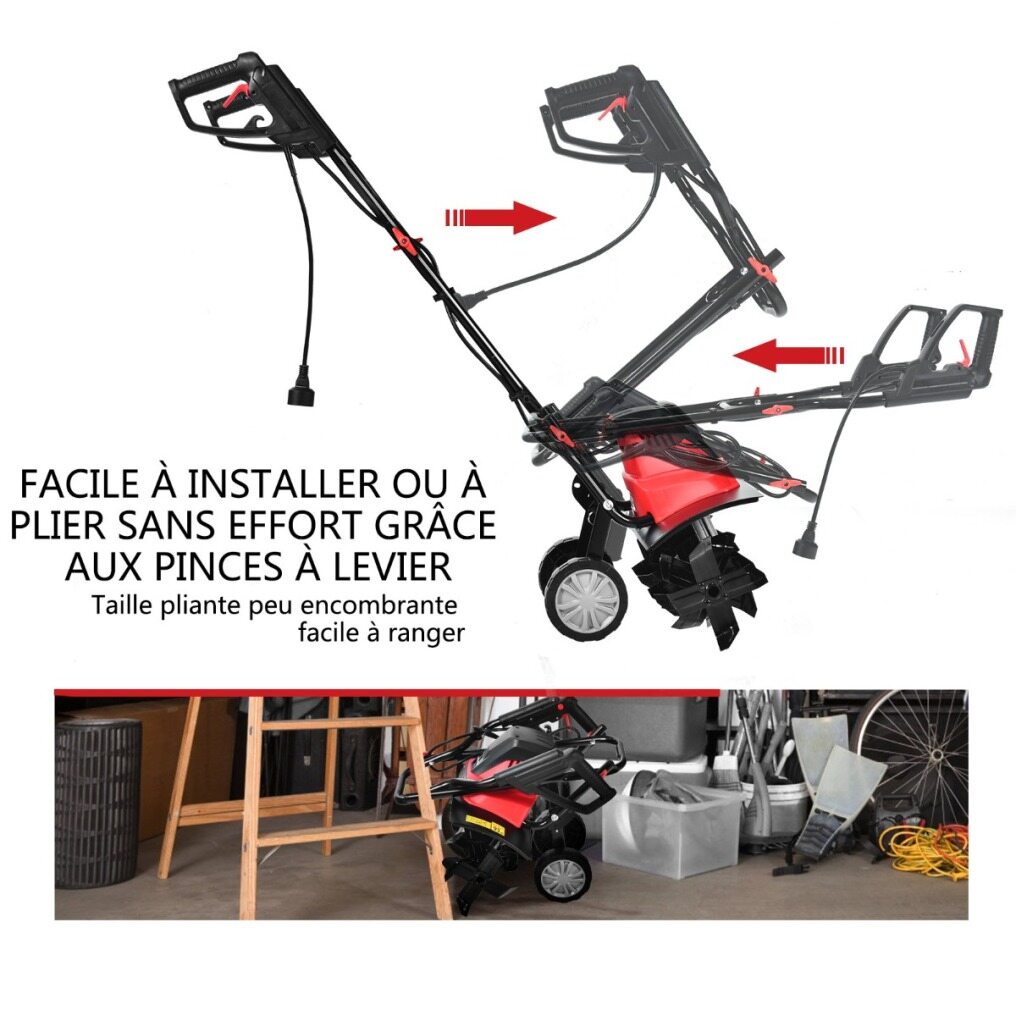 The electric tiller is a good choice for people who focus on functionality. All because of quite small dimensions of this device, allowing it to be stored even in small compartments, where similar equipment in standard sizes will not fit. The electric garden cultivator is equipped with wheels that allow easy movement on any surface, as well as maneuvering in hard-to-reach spaces. It is an excellent choice when there are numerous flowerbeds or paths in your garden.