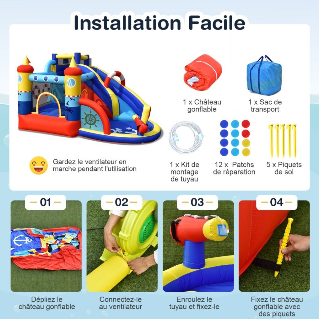 Complete accessories: for maximum comfort during use, this jumping house comes with an accessory kit consisting of a carrying bag, an assembly kit with hose, 12 repair patches and 5 chopsticks. This makes it easy to assemble and store.