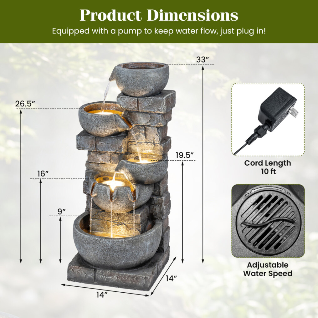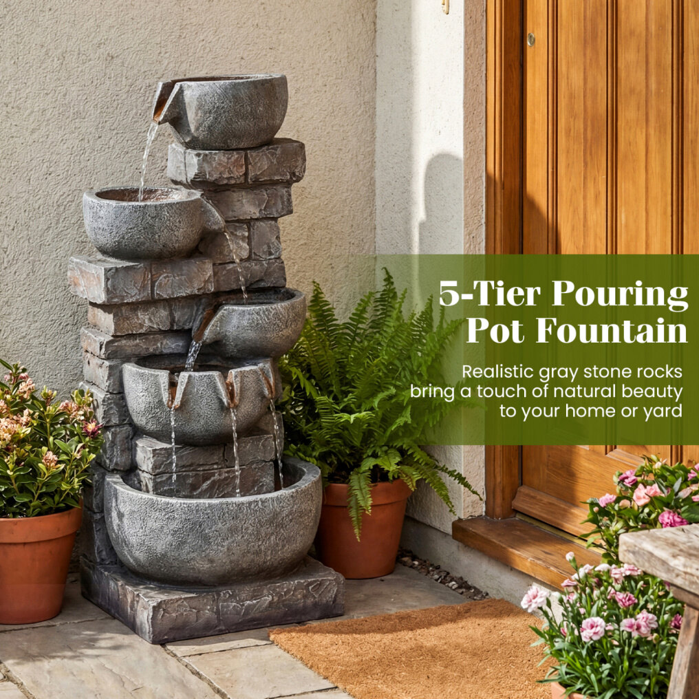 ● Reliable Resin and Fiberglass Construction: Crafted from sturdy resin and fiberglass, the 5-tier pouring pot fountain ensures excellent weather resistance and long-lasting performance. Moreover, it offers a realistic stone-like look with gray rocks, bringing a touch of natural beauty to your home or yard.