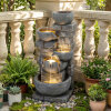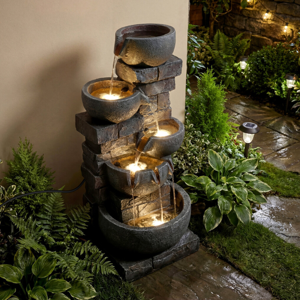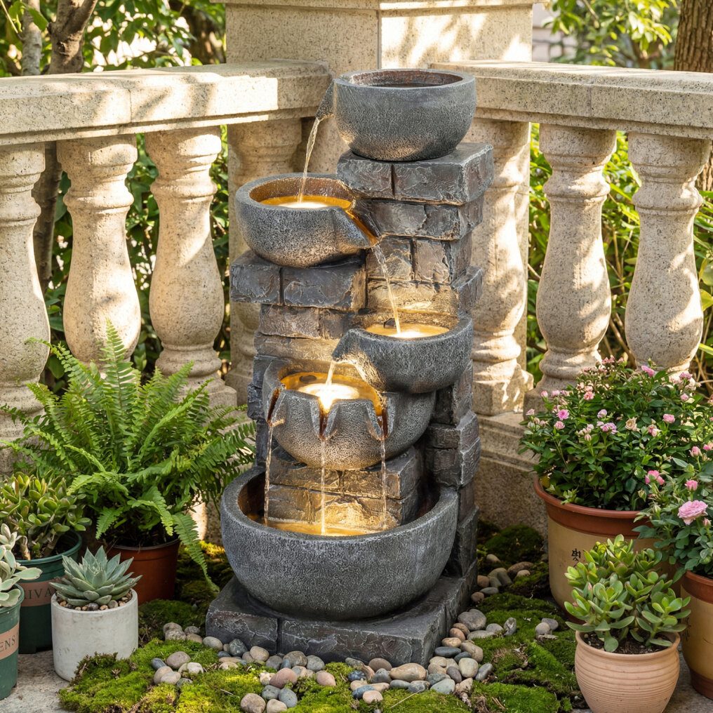 ● Warm White Illumination: Equipped with 24 built-in LED lights distributed across 4 bowls, the water fountain creates a soft, inviting glow that highlights the flowing water at night. It transforms your garden or porch into a captivating 24-hour attraction without extra lighting.