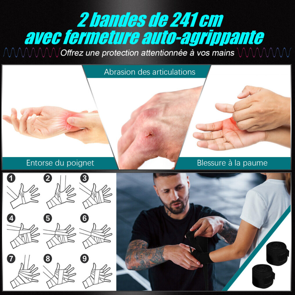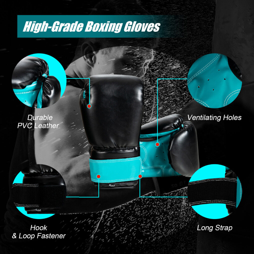 Professional hand protection: 8 oz (226.8 g) boxing gloves and 241 cm long wraps protect children's hands from wrist sprains, knuckle abrasions and other injuries. The soft filling and ventilation holes of the gloves ensure the comfort of exercise, and the Velcro fasteners make it easy to put them on.