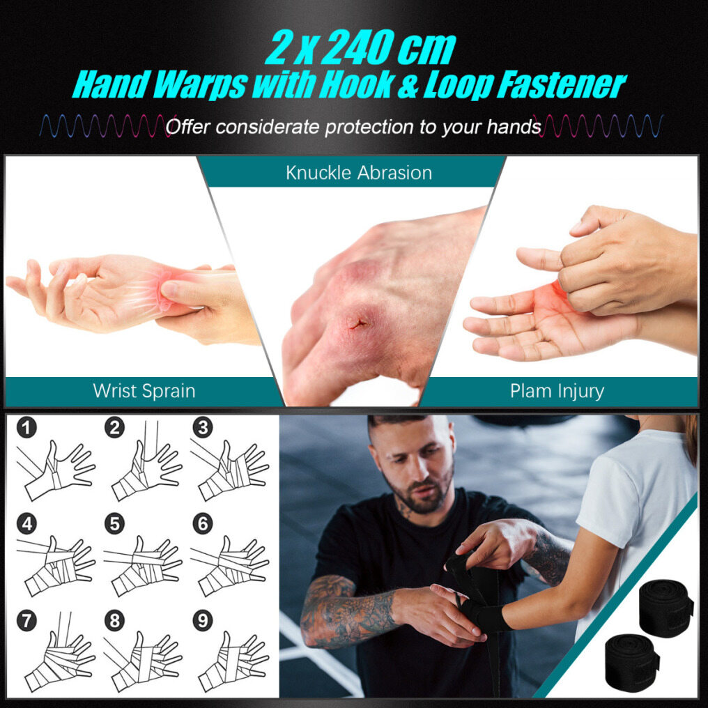 - Double hand protection: wraps and boxing gloves included