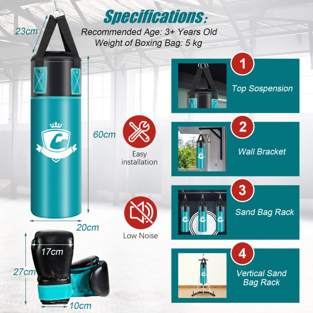 Our boxing set will help you get your child interested in sports from an early age. Excellent materials and workmanship guarantee durability and safe use. The multi-layer coating ensures optimal hardness and good rebound. A set of mounting elements will allow you to hang the bag from the ceiling, on a stand or wall arm. Gloves with thick padding and ventilation holes and two wraps protect the child's hands from injuries. You don't have to worry that the bag will be too heavy: the flap with a zipper allows you to adjust the weight or replace the filling. Buy the set today and give your child a healthier lifestyle!