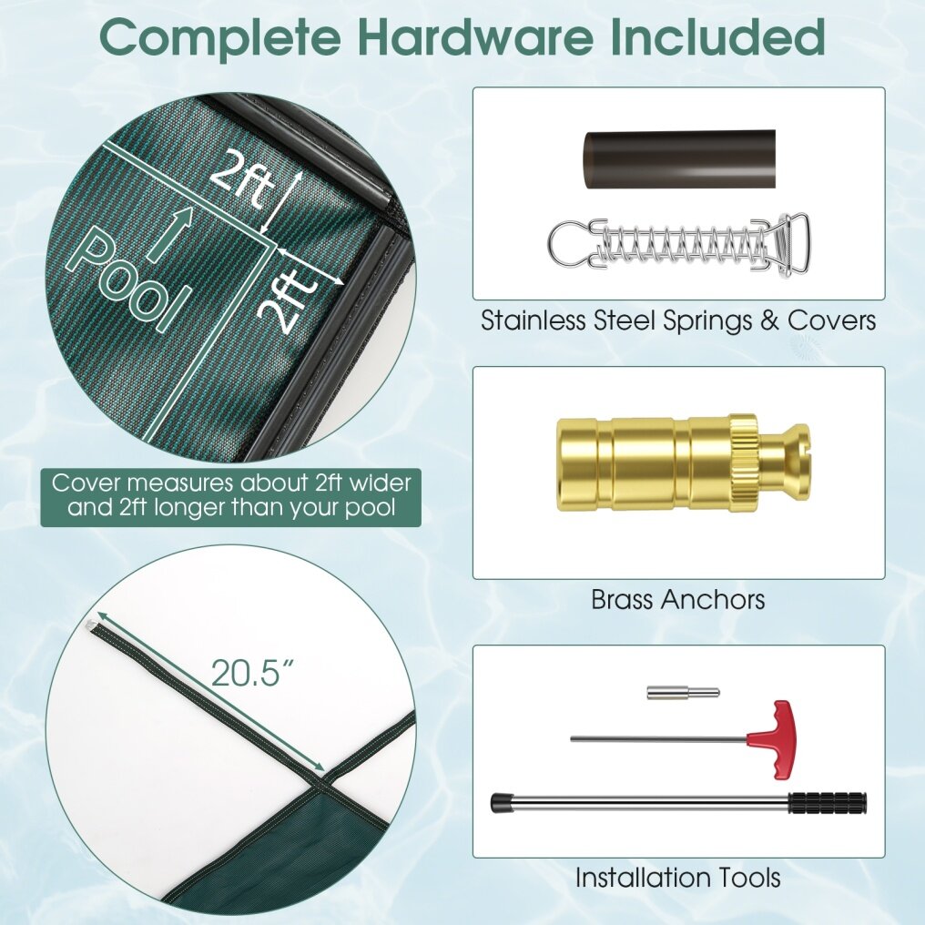 ● Complete Hardware included: The package comes with all necessary accessories you need to effortlessly install the cover: 1 x folding pool cover, 24 stainless steel springs, 24 brass anchors, 24 spring covers, and 2 installation tools.