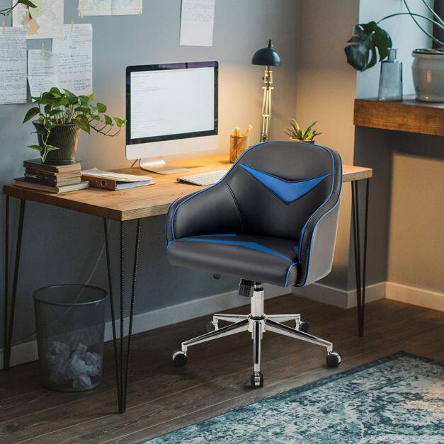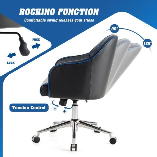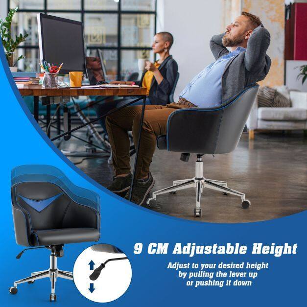 There's no better way to get lost in a game or focus on work than on this mid-back office chair, which features an ergonomic design and a sturdy structure. Covered with faux leather and filled with elastic sponge, the chair offers ultimate comfort and extended service life. The lumbar support reduces the stress and fatigue that would result from sitting for long periods. The height-adjustable seat will meet your different needs and is designed for people of different heights. If you are tired from tedious work or playing, the rocking function will surprise you. If you want to move around to chat with your colleagues or just grab something while you play, the smooth-rolling casters are the perfect solution. If you want to add a functional chair to the home office, this office chair is a good choice.