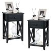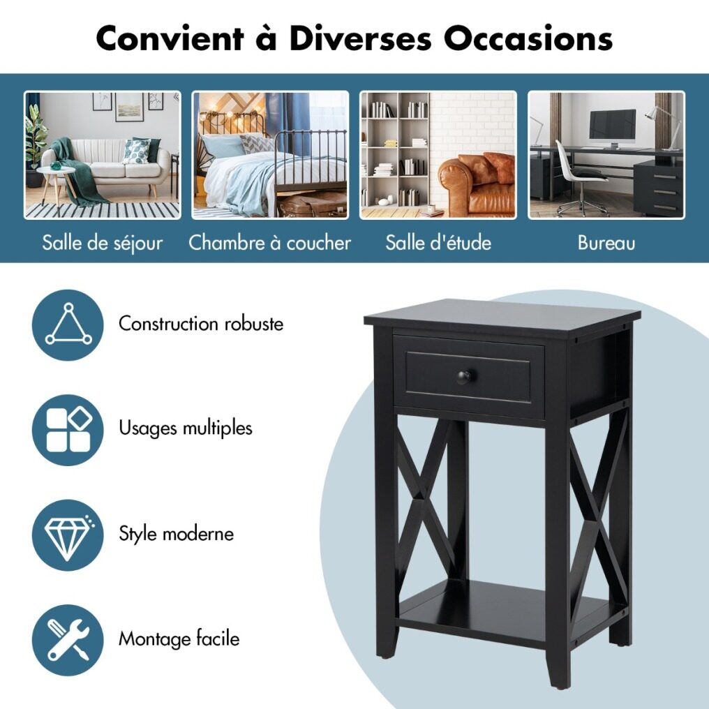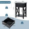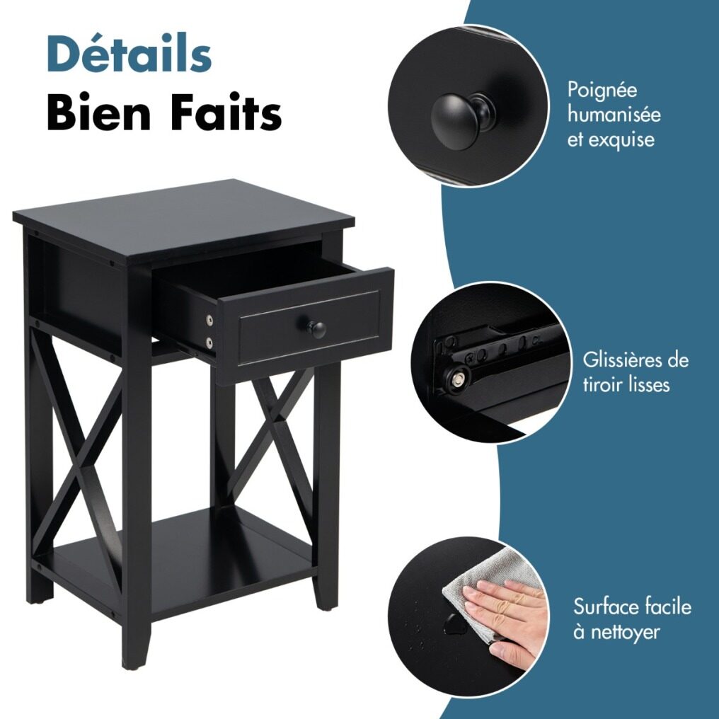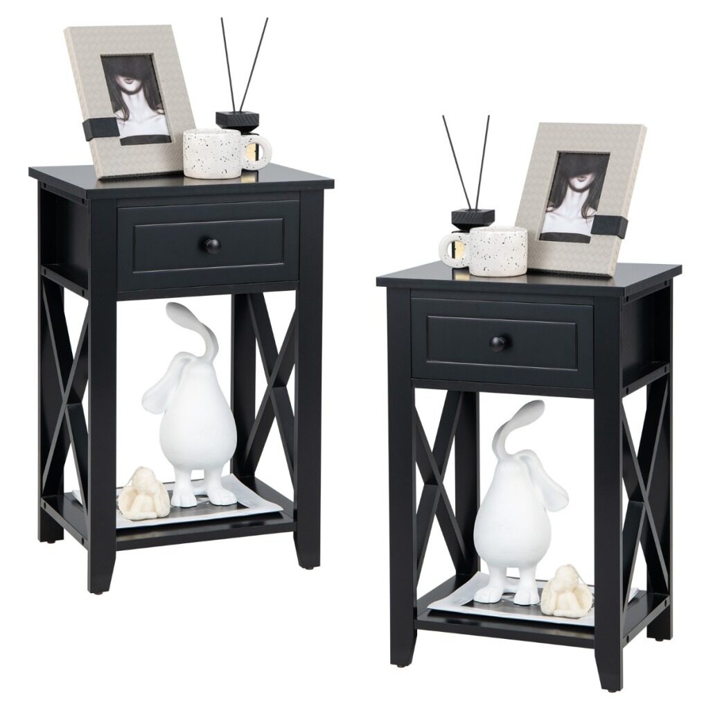 Upgrade your bedroom with our modern X-design bedside table! This compact table offers plenty of storage space and can be used as a bedside table, side table, storage cabinet, etc. in your home. The spacious table top and open shelf are ideal for storing or displaying your mugs, photo frames, books, storage boxes, decorations and more. Also, the bottom drawer provides hidden storage space for your personal belongings and protects them from dust. You can easily pull out the drawer with the help of the practical knob and the smooth-running guides. Made of high quality MDF, this side table is super sturdy and durable. In addition, this bedside table features an X-shaped structure, non-slip foot pads and an anti-tip device for greater stability and safety. With a modern and simple design, this side table goes well with any home decor and adds a sense of delicacy to your room.