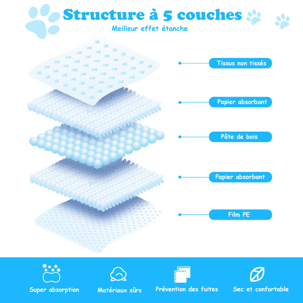Our disposable pads have 5 layers to ensure instant absorption and prevent leakage. Made from premium materials, our pads are durable, skin-friendly and soft. Also, they are appropriately sized to fit the needs of most pets and can be used in multiple ways. Additionally, the pads, specially designed for dogs, are good for puppy training, supporting older dogs, or as a clean alternative for the outdoors. You can use them anywhere you want to avoid unpredictable accidents or everyday clutter. These training pads absorb urine effectively and reliably and offer easy and hassle-free cleaning.