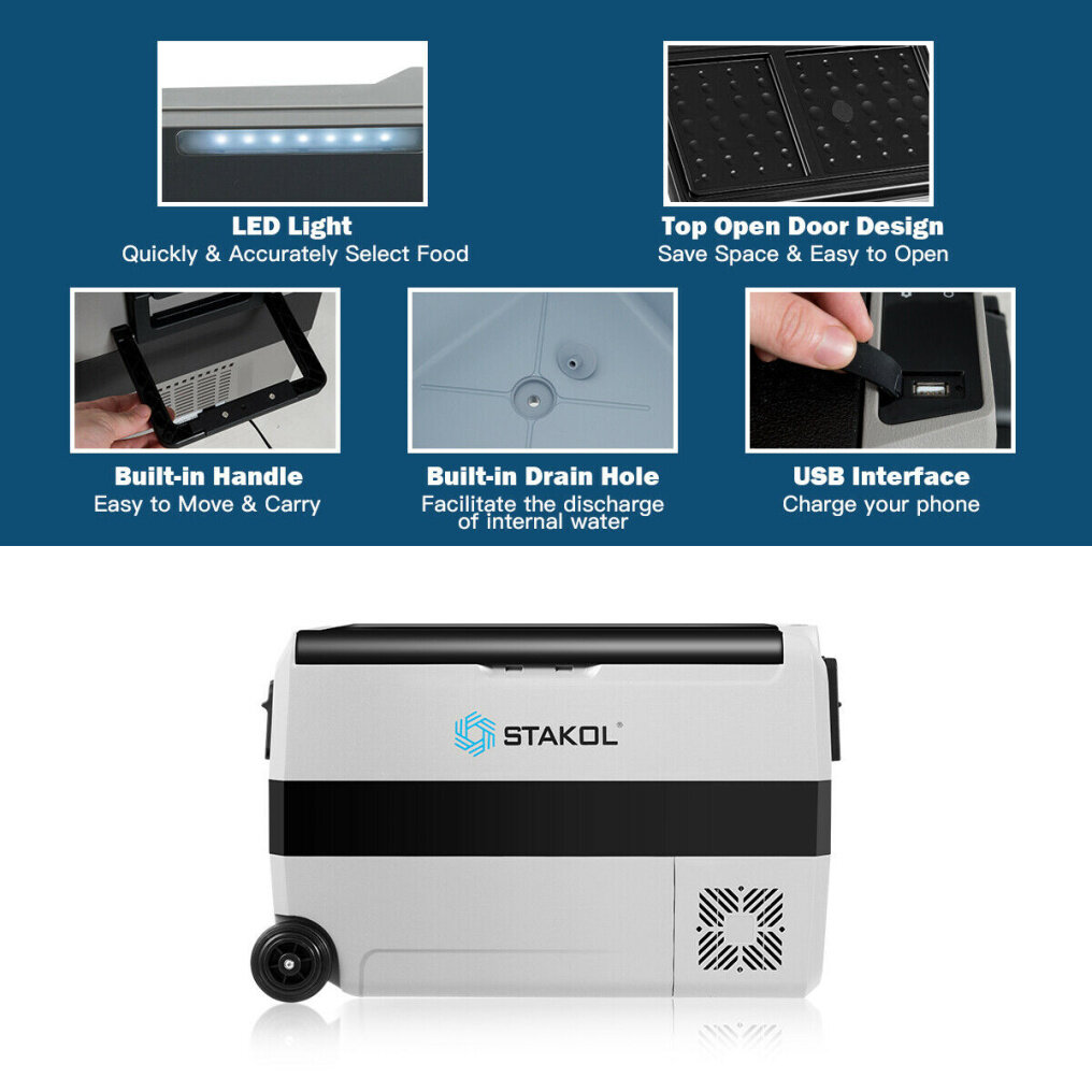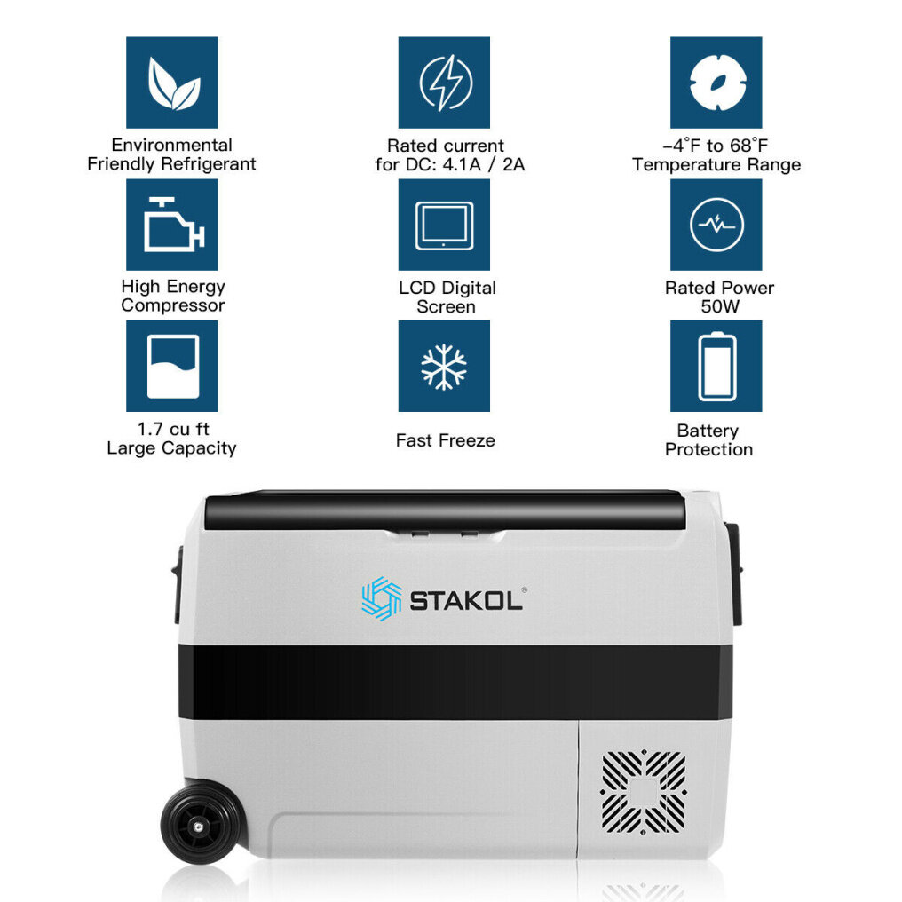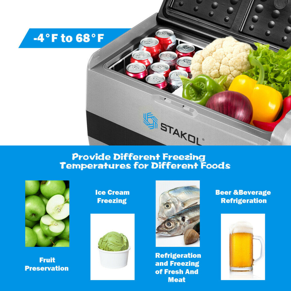 This portable car refrigerator with high quality meets your freezing/refrigeration needs. It is ideal for homes, cars, yachts and outdoor use. 1.7 cu ft large capacity is enough for you to store a variety of foods, such as drinks, meat, fruit and so on. This design can keep your food fresh and the drink cool at the same time. The easy-to-operate control panel allows you to choose the right temperature. The standard household outlet and 12/24V car charger are equipped to increase the utilization of the compressed refrigerator.