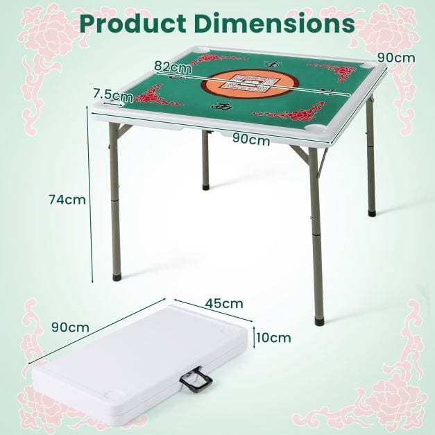 ● Quick Set Up: This portable mahjong table is easy to set up. Just unfold the frame and legs, and insert the short leg parts, and finally place the game mat, and you're ready to play. The overall dimensions are 35" x 35" x 29" (L x W x H).