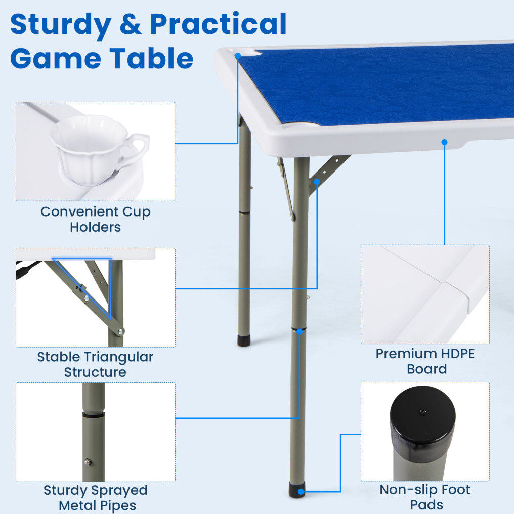 ● Sturdy and Stable Game Table: Built to last, this foldable game table features sprayed metal pipes and a premium HDPE board for long-term use. Besides, the sturdy triangular structures and non-slip foot pads ensure that the table remains steady during play.