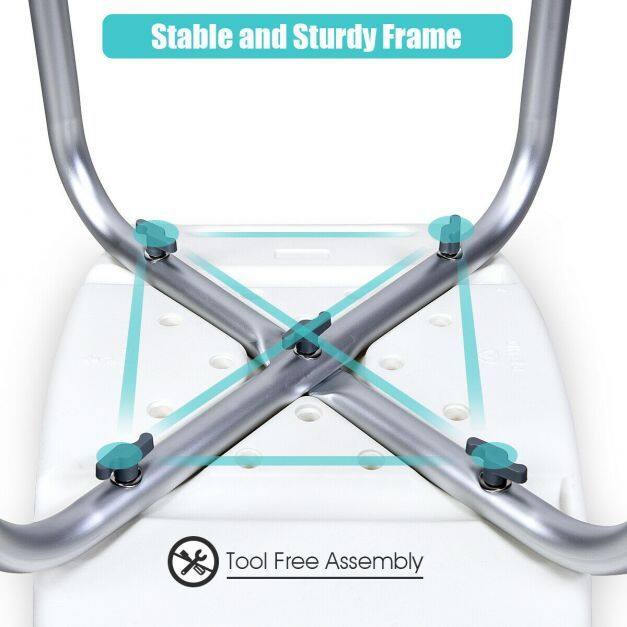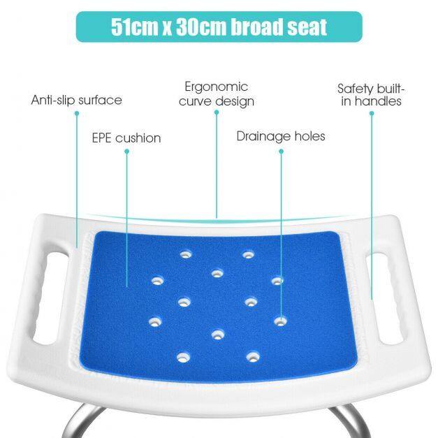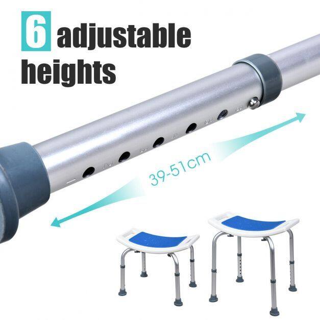 ● Adjustable Height Settings: This shower chair is adjustable with 6 various heights from 15” to 20". Such a feature is there to easily meet your various needs on daily basis. On the other hand, it's perfect for people that have difficulties standing during the shower. Therefore, we consider this as a special tool for the elderly, disabled and injured.