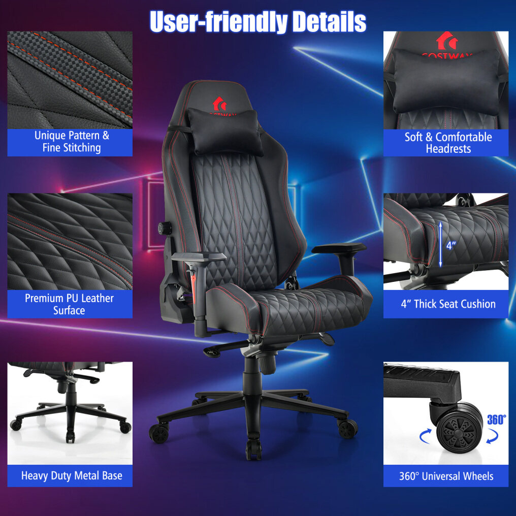 ● Premium Material: Made from a high-quality metal frame, the sturdy gaming chair features a high capacity of 400 lbs. Apart from that, covered by selected PU leather and padded with a shaped sponge, this 4" thick seat cushion provides a soft and comfortable sitting experience.