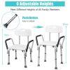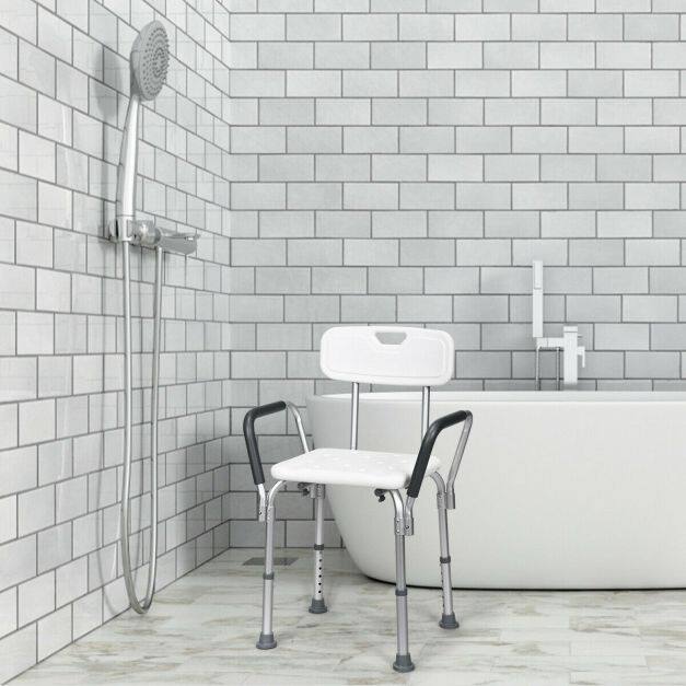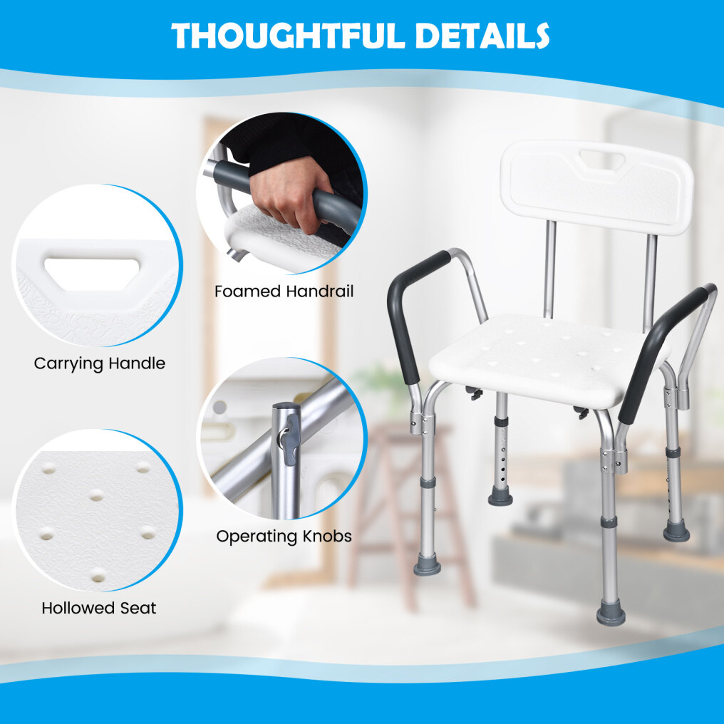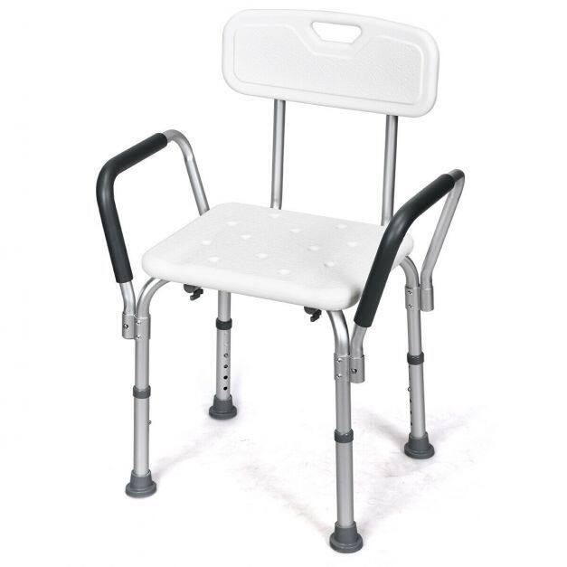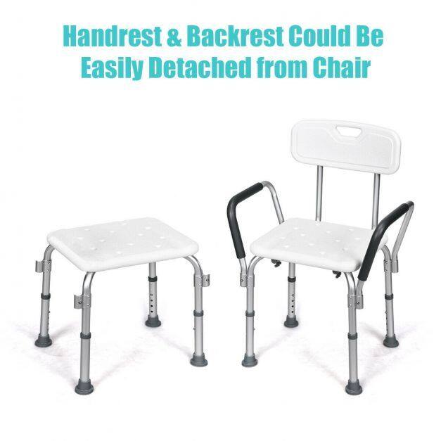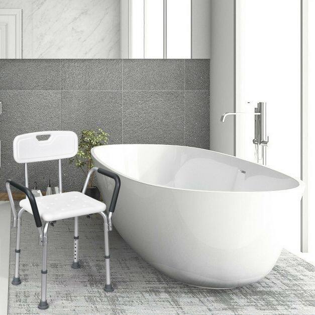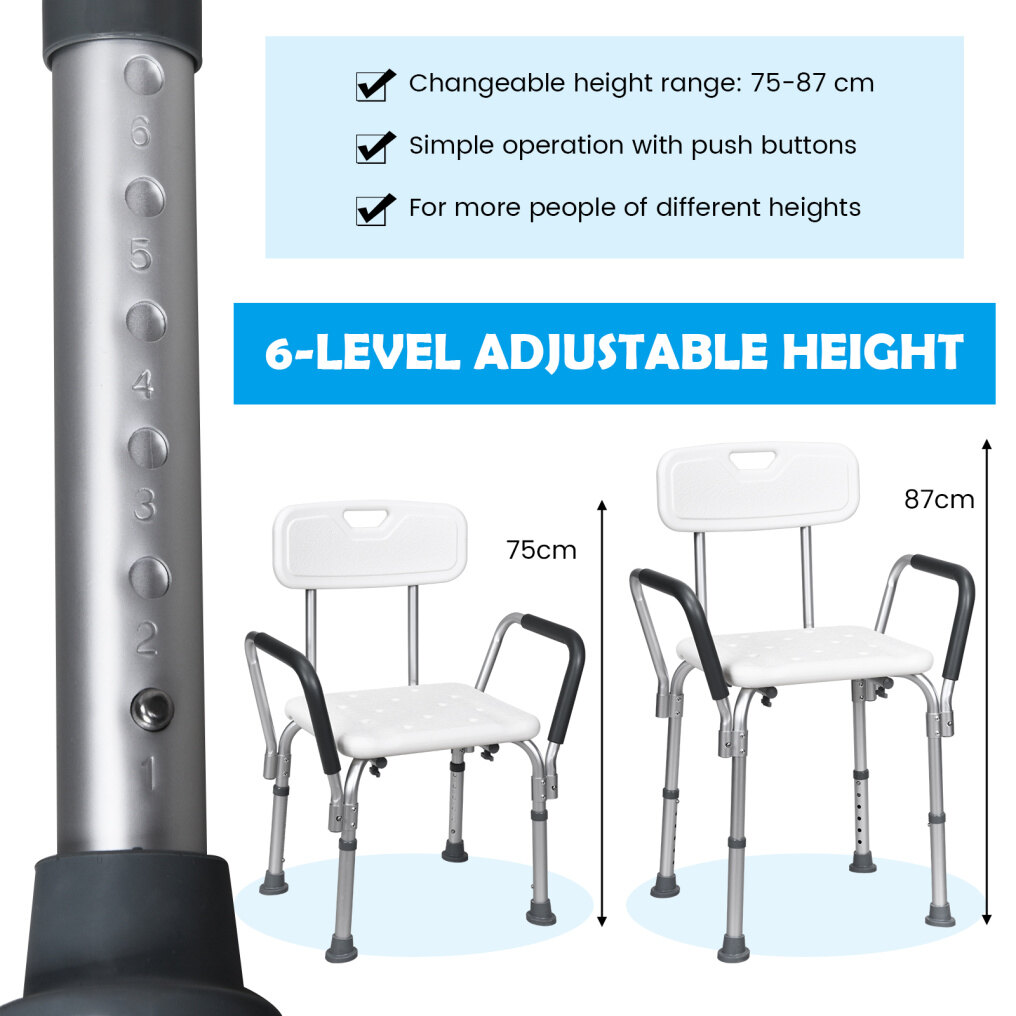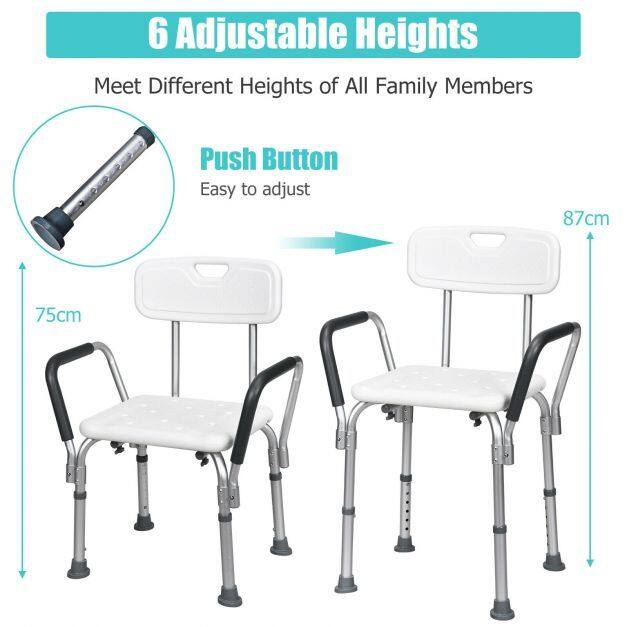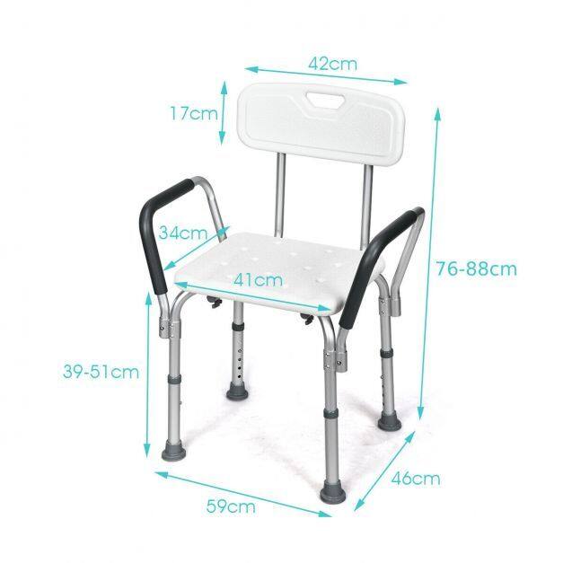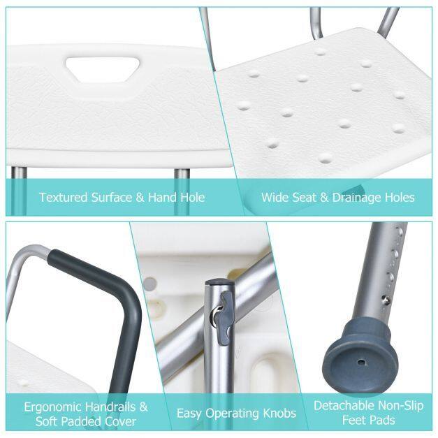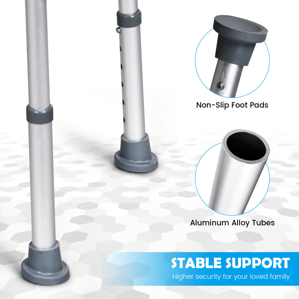 This bath chair with the backrest adopts an ergonomic design, which offers support and comfort for you. You will enjoy a cozy and soft sitting experience with EPE pads on both seat and back. What's more, this shower chair can be adjusted to 6 heights, which will not only meet your various needs, but also be perfect for seniors, the handicapped, and the injured. The aluminum frame is lightweight and ensures the stability and durability of this shower chair. Also, rubber pads work great in avoiding slipping and sliding, improving your safety in use.