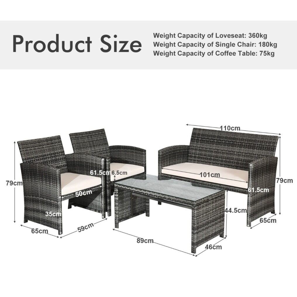 Dimension of the Patio Set: The single sofa dimension is 59cm x 65cm x 79cm (L x W x H), size of the double sofa: is 110cm x 65cm x 79cm (L x W x H) and the size of coffee table: 89cm x 46cm x 44.5cm (L x W x H). Benefiting from quality materials and sturdy construction, the weight capacity of the coffee table is 75kg, the weight capacity of the single sofa is 180kg and the weight capacity of the bench is 360kg.