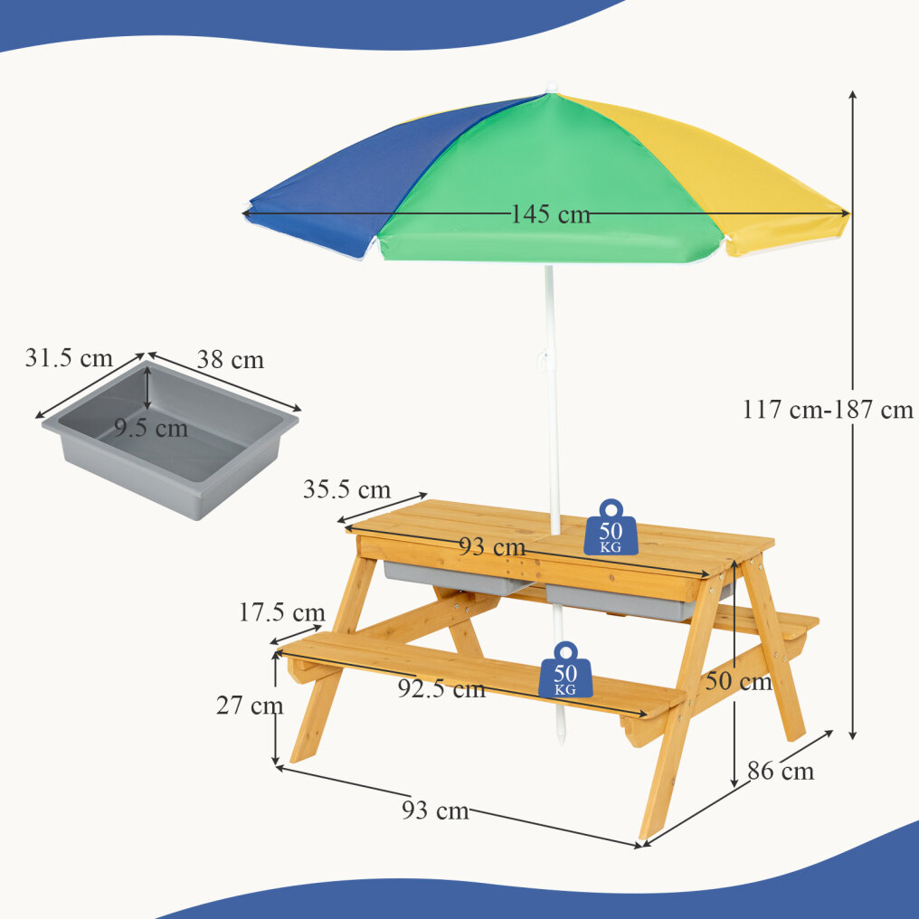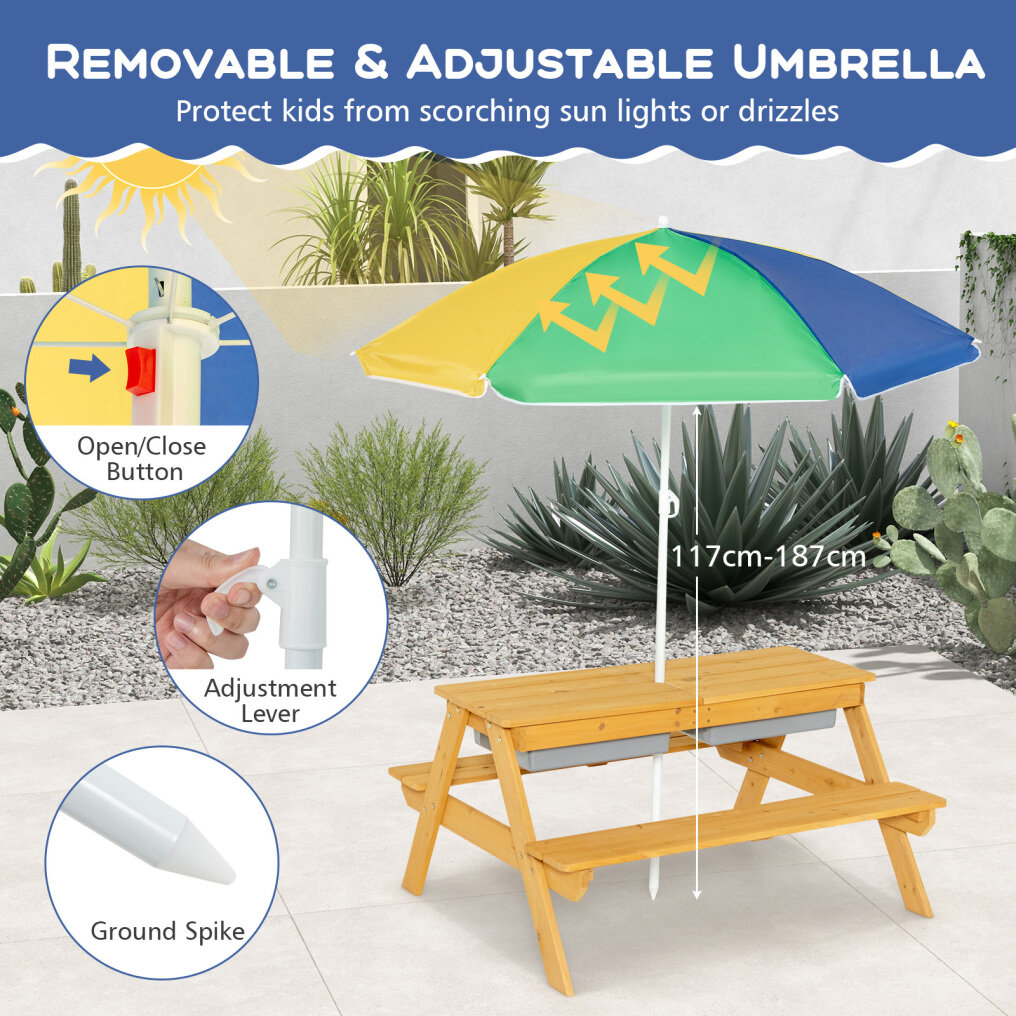 ● Removable and Adjustable Umbrella: Different from other traditional kids' picnic table sets, this 3 in 1 kids' multifunctional table is equipped with a height adjustable umbrella, which can be adjusted from 43.5" to 66.5", adapting to children of different heights. And the umbrella can be removed if it is not needed.