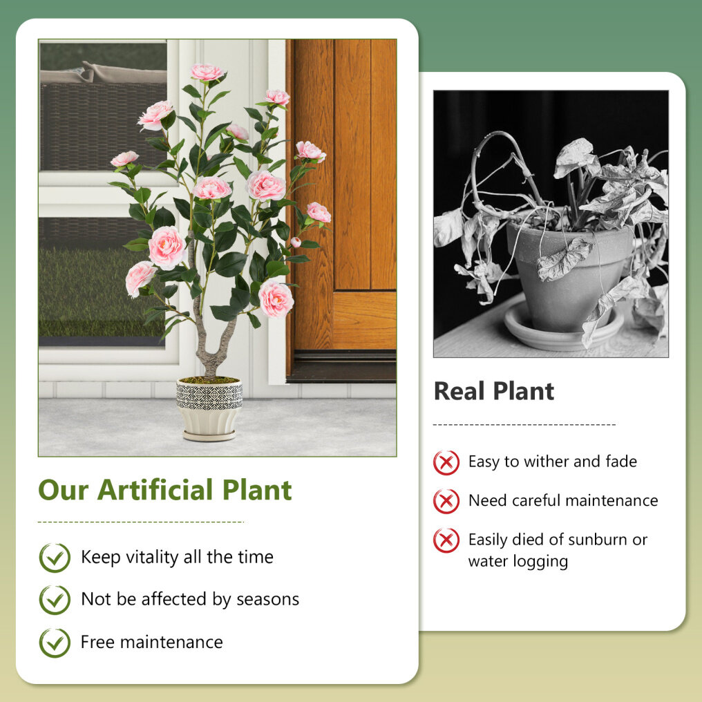 ● Reliable Materials: Crafted with premium polyester flowers and PEVA leaves, this faux camellia tree maintains its color and texture for years without fading or shedding. The flowerpot is stabilized with built-in cement to ensure the tree remains upright and secure.