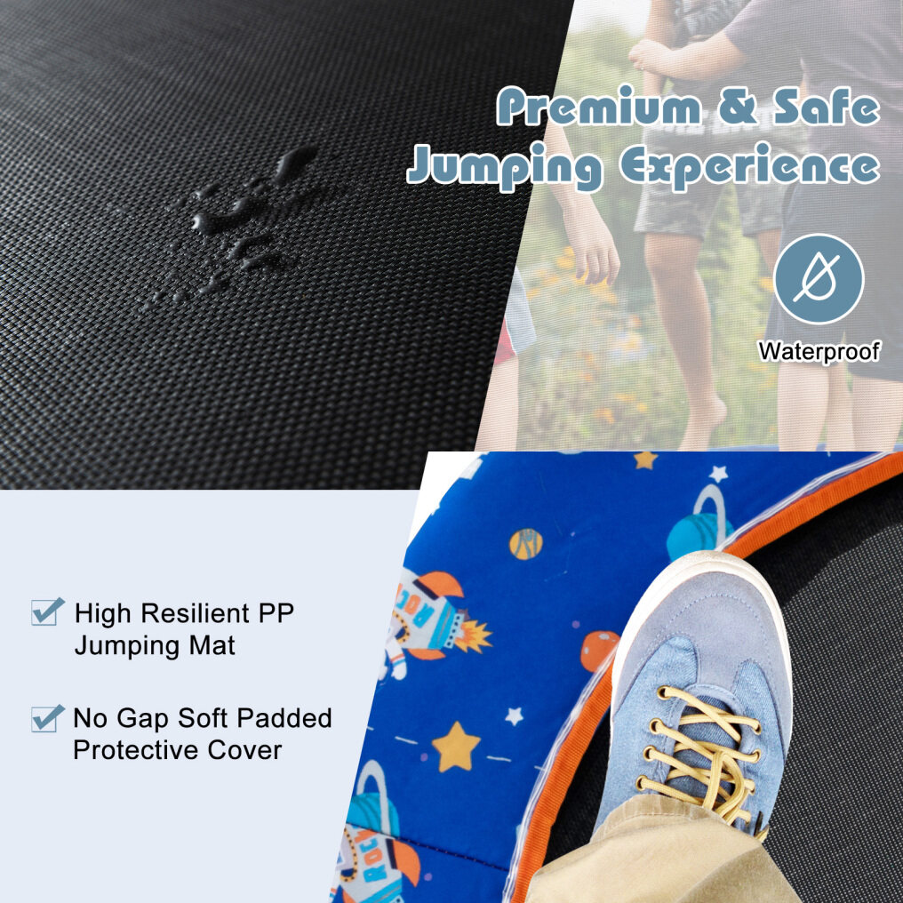 ● Secure & Silent Bouncing Experience: The 6-row stitched PP jumping mat and 20pcs high elastic bungee cords with 6mm thickness work together to give your kid an excellent and quiet bouncing experience. What's more, the trampoline features an anti-slip EVA foam handle to offer comfortable and stable grips and a thick padded safety cover to prevent kid's feet from getting stuck.