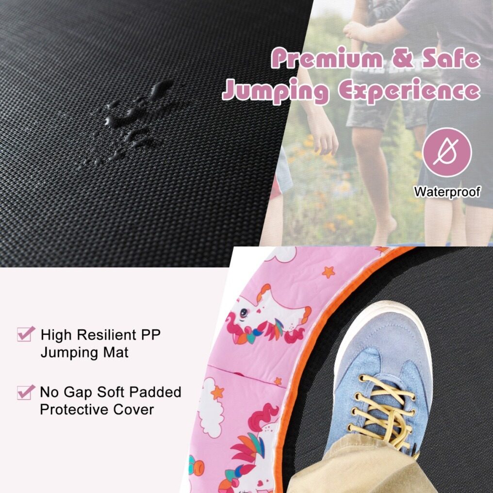 ● Secure & Silent Bouncing Experience: The 6-row stitched PP jumping mat and 20pcs high elastic bungee cords with 6mm thickness work together to give your kid an excellent and quiet bouncing experience. What's more, the trampoline features an anti-slip EVA foam handle to offer comfortable and stable grips and a thick padded safety cover to prevent kid's feet from getting stuck.
