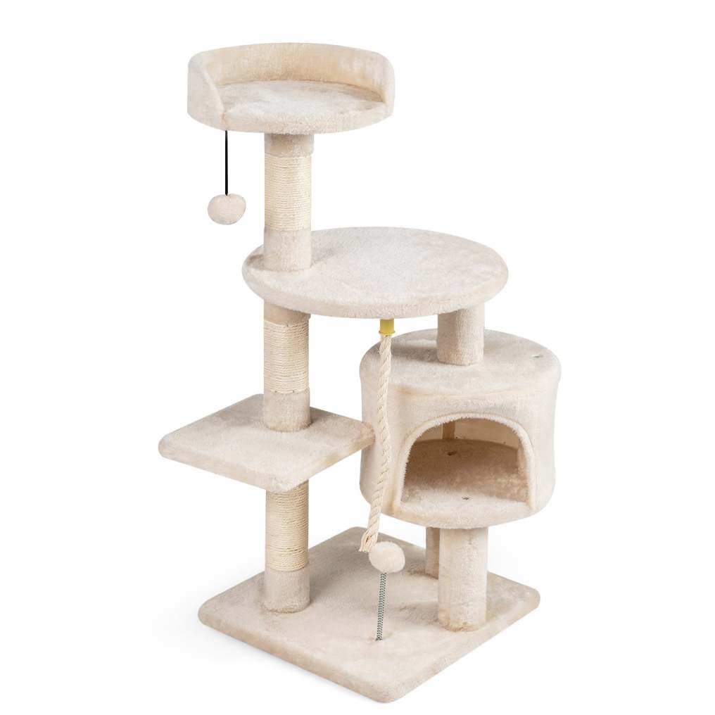 ● Satisfy Scratching Needs: The cat tree comes with 3 scratching posts and an enticing hanging rope, ideal for cats to scratch and maintain healthy claws. Crafted of natural and safe sisal material, it offers reliable and wear-resistant scratch surfaces.