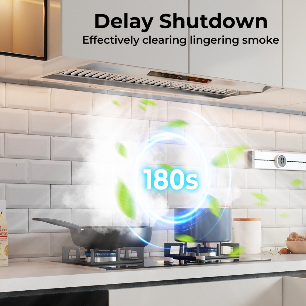 ● Advanced Control Options: Equipped with versatile touch, gesture, and remote control functions, this kitchen hood allows users to operate it effortlessly. It includes a convenient 15-minute timer and a 3-minute delay-off timer, enhancing usability while maintaining precise control over your ventilation preferences.