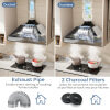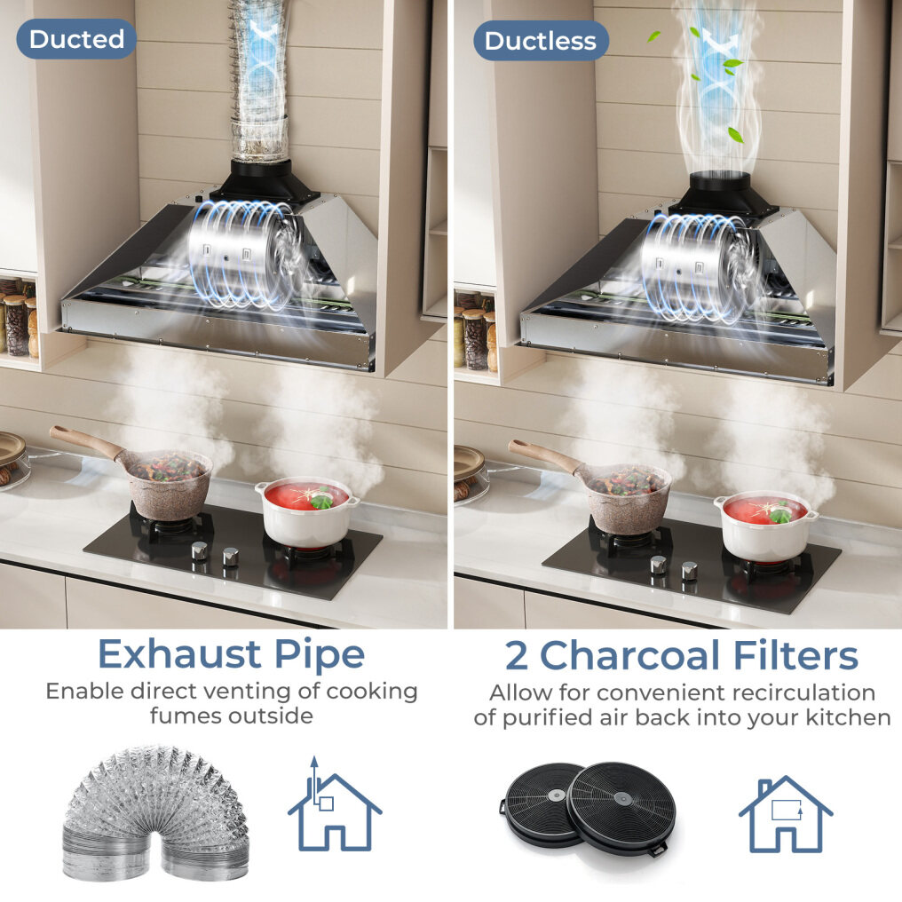 ● Convertible Exhaust Flexibility: This kitchen exhaust fan supports both ducted and ductless installations. It includes an exhaust pipe for ducted mode and 2 charcoal filters for ductless use. Plus, the range hood vent operates at a quiet 23.5-60dB in ducted mode and 70dB for ductless, balancing performance and noise levels.