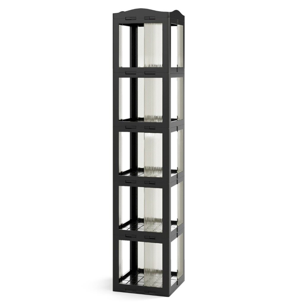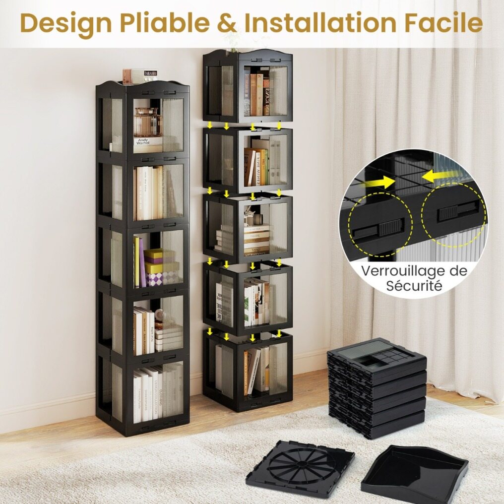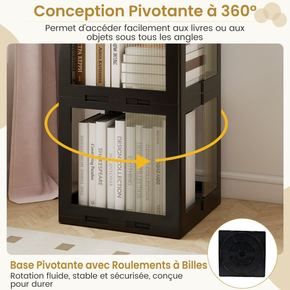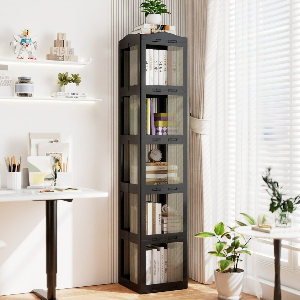 This rotating bookcase is designed to maximize space while providing easy access to your favorite books and decorative items. Featuring a 360° swivel base, this bookcase rotates smoothly, allowing you to easily browse your collection from any angle. Its foldable design adds versatility, making it convenient to store as needed. Designed with translucent panels, this storage organizer blends discreetly into your space. Its corner-friendly shape utilizes often-overlooked areas, making it a practical choice for various environments requiring efficient storage solutions.