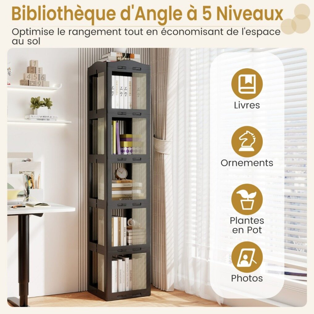 5-tier corner bookcase maximizing storage while saving floor space