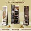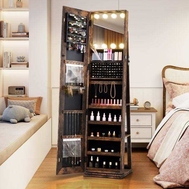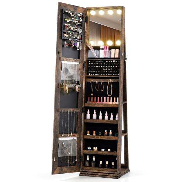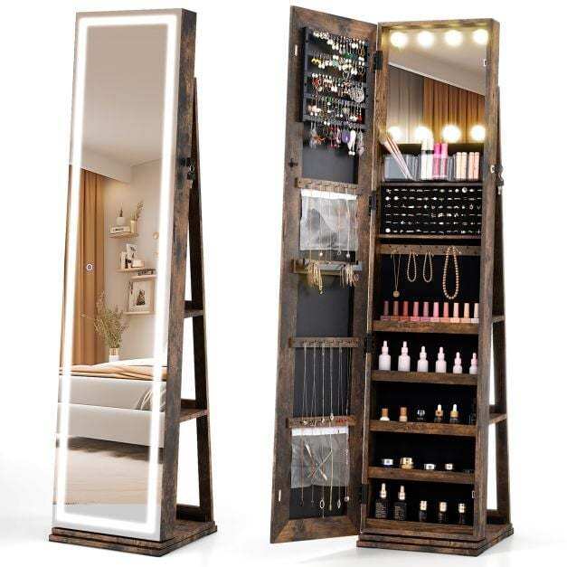 The standing jewelry organizer comes with a full-length mirror, a jewelry cabinet, and back storage shelves for you to use. The 360° rotatable design makes it convenient for you to access your jewelry without moving. There are 80 earring slots, 78 ring slots, 30 necklace hooks, 5 storage shelves, 3 acrylic storage boxes, 2 storage pockets, and 1 bracelet rod. The full length mirror and interior makeup mirror have LED lights, helping you clearly see your face. With anti-slip foot pads, the jewelry cabinet remains steady on the ground. Furthermore, the jewelry organizer is also designed with a lockable door with 2 keys, cut-out handle, soft lining, and magnetic catch.