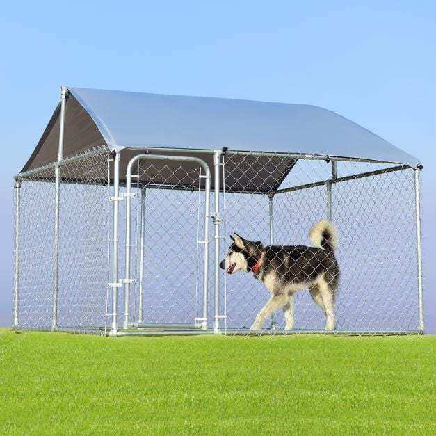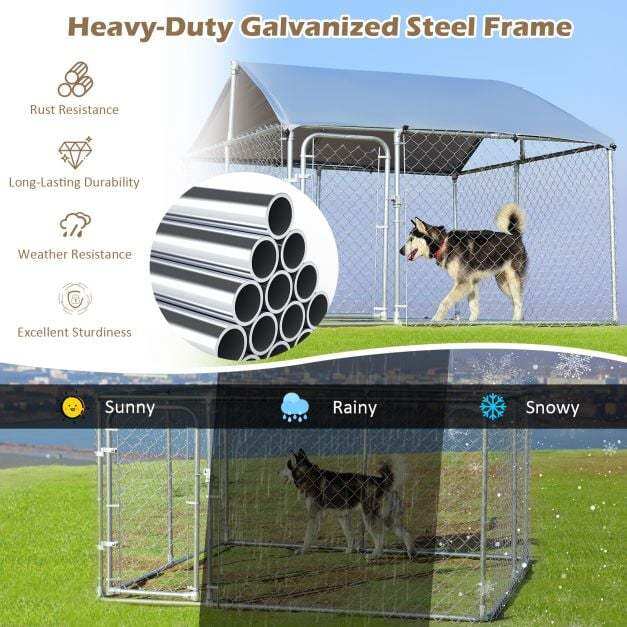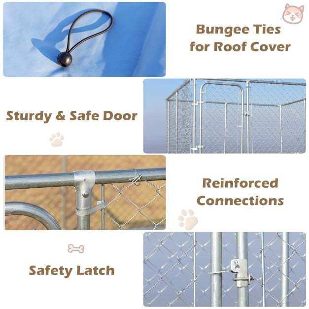 Constructed from heavy-duty galvanized metal tubes and welded metal mesh, this dog run cage is guaranteed to last for many years to come. The protective cover is made from durable Oxford fabric with a silver coating, which is waterproof and sun resistant. Plus, bungee cords firmly fix the cover to the enclosure for a snug fit. This pet enclosure provides a roomy and safe area for them to exercise, play and enjoy the fresh air. Last but not least, our pet exercise pen is suitable for dogs, cats, chickens, rabbits and more. If you are looking for such a product, do not hesitate to buy it!