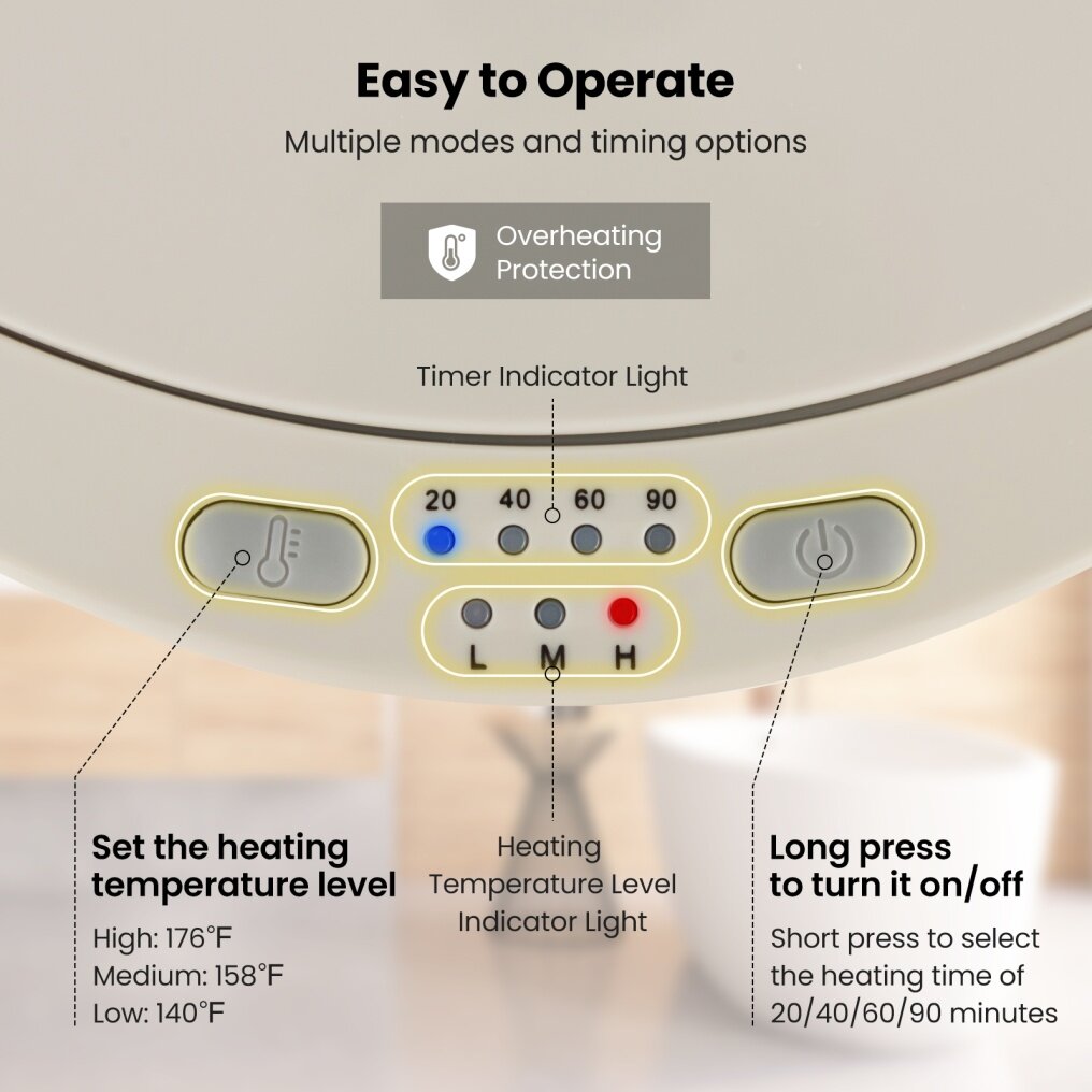 ● Easy Operation and Upgraded Safety: You can long press the power button to turn it on/off or short press to select the heating time of 20/40/60/90 minutes. The timer indicator light and heating temperature level indicator light will show you the current setting clearly. Plus, the towel warmer features overheating protection for safe use.