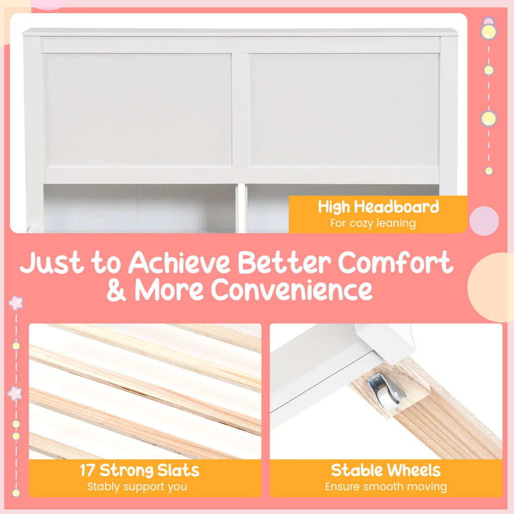 ● Dual 4-Tier Bookshelf: The platform bed is fitted with a 4-tier bookshelf on each side. Parents can put toys, books or clothes inside and push them into the high headboard, so the hidden storage can always guard the neatness of your kid's room.