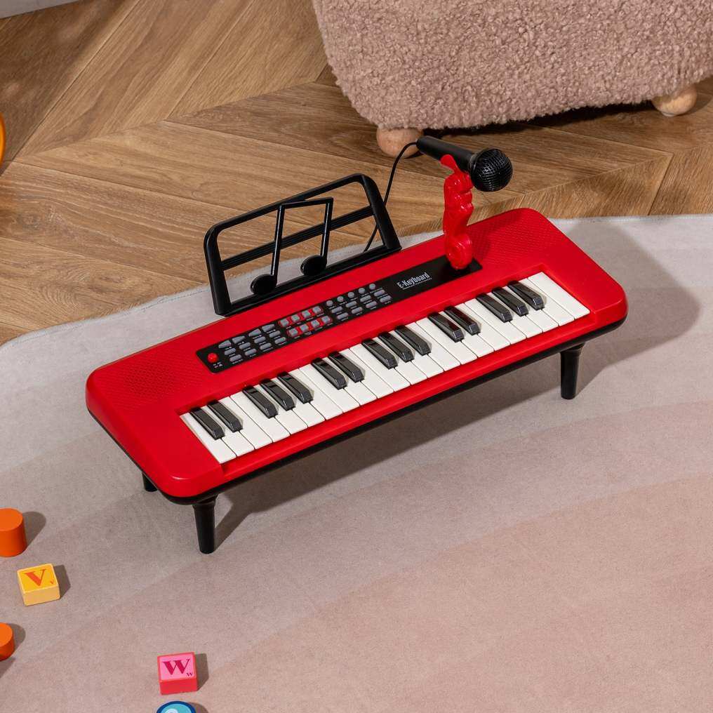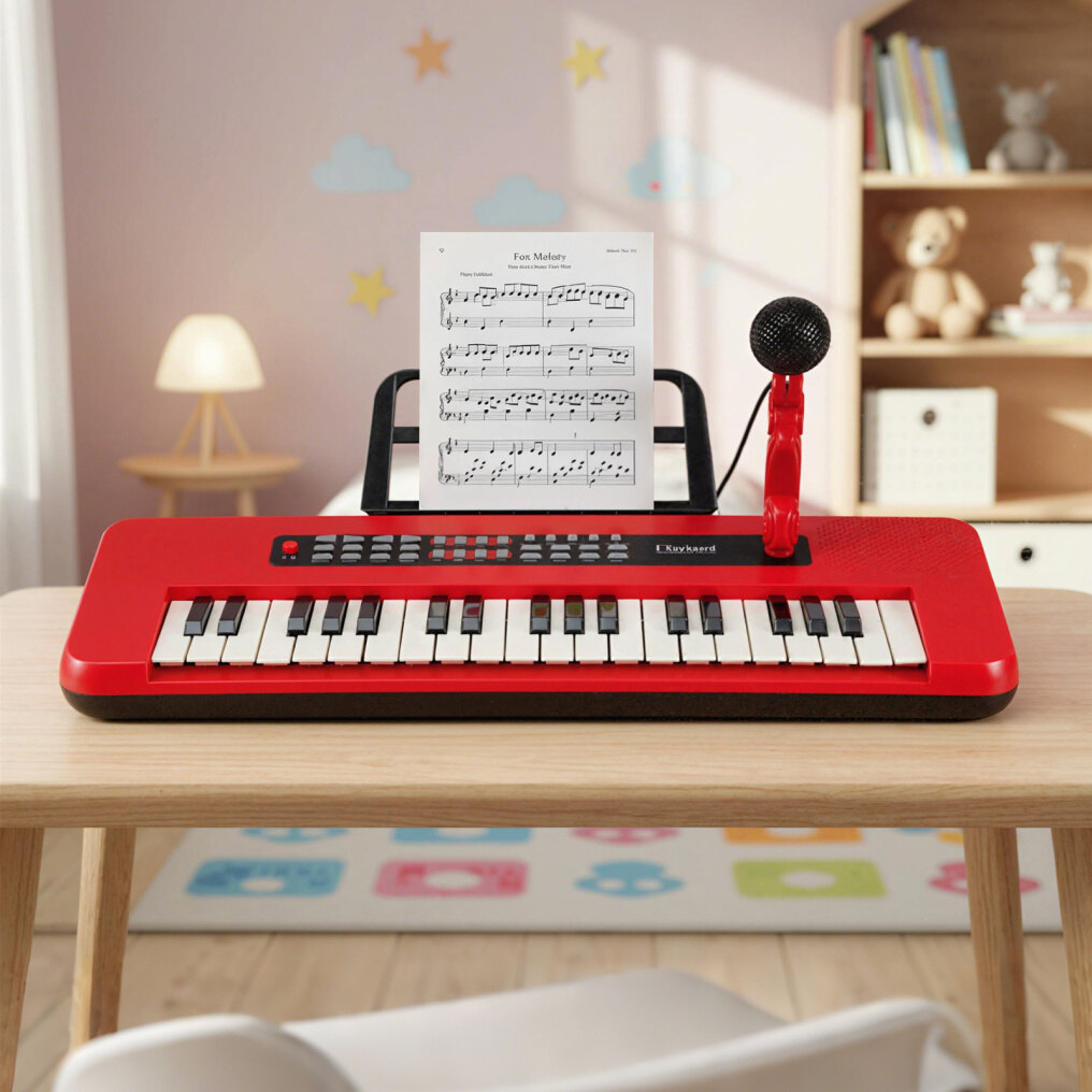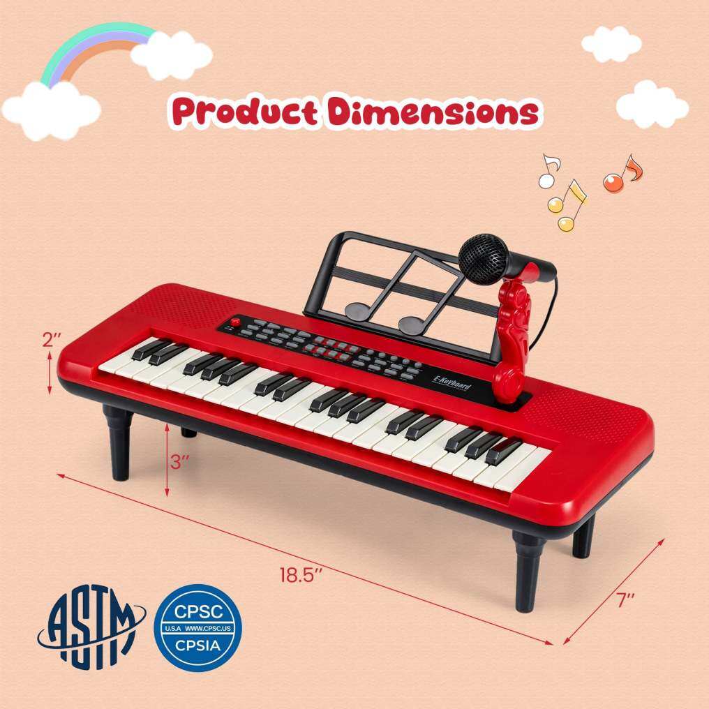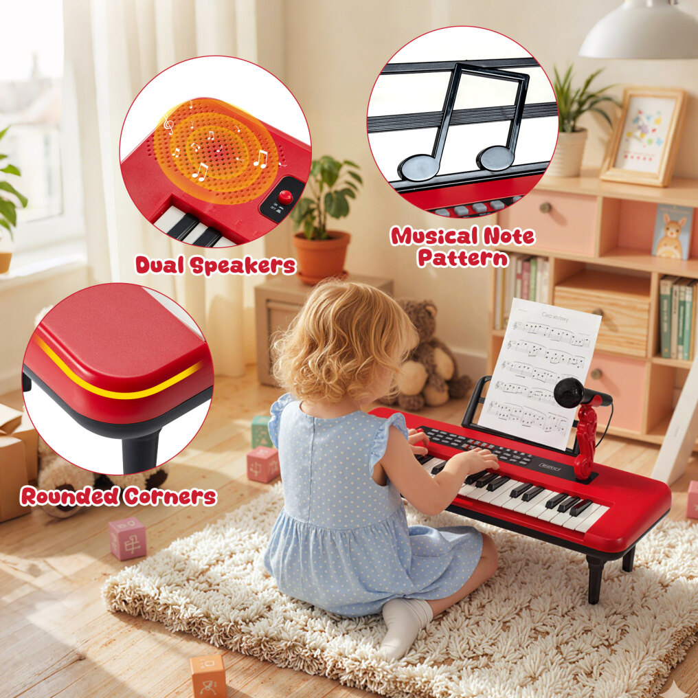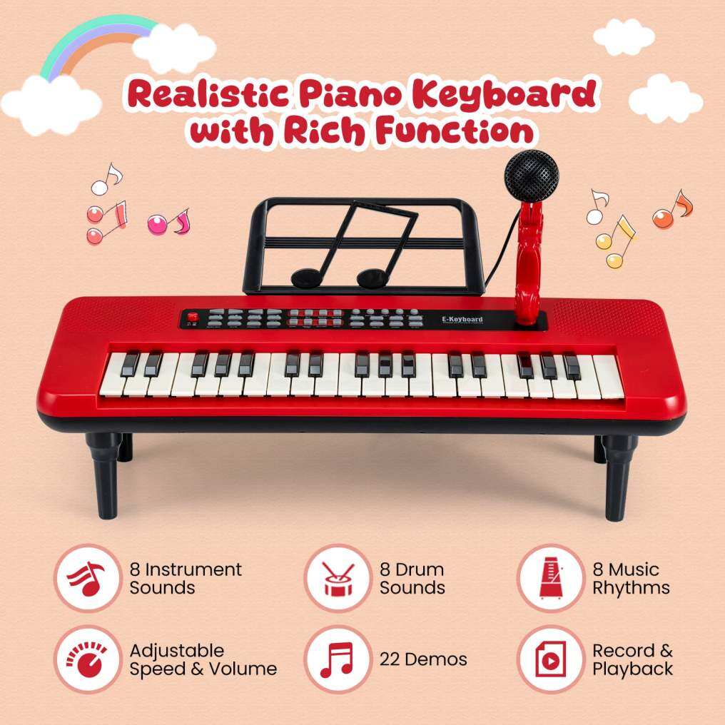 Realistic Kids Piano Keyboard: Featuring 37 keys and functional buttons, the children piano keyboard offers 8 instrument sounds, 8 drum sounds, 8 music rhythms, and 20 demos. Your little musician can also adjust the volume and speed. Plus, the microphone allows kids to sing along while they play the piano.