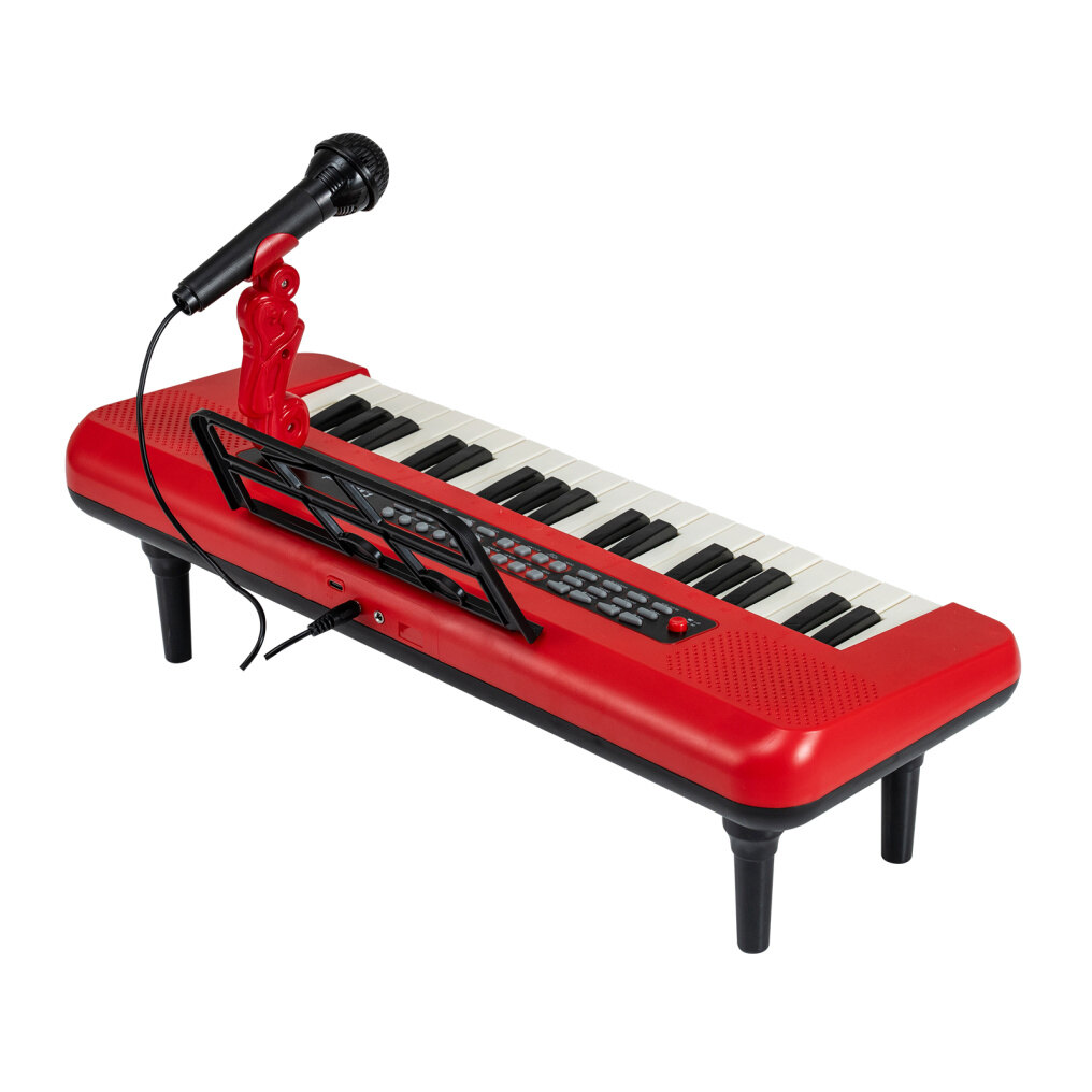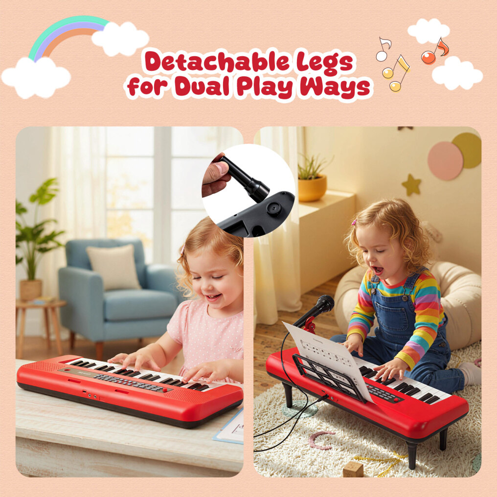 The musical note pattern and bright color appeal to children. Plus, the digital keyboard has 8 instrument sounds, 8 drum sounds, 8 music rhythms, and 20 demos for kids to enjoy. 37 realistic keys help your little musician create their own music. The microphone also brings kids added singing fun. With detachable legs, the mini piano supports tabletop and floor use. All corners and edges are rounded, ensuring a safe play area for kids. Dual power supply methods make it easy to charge. There are 3 sockets to connect to the power cable, MP3, and microphone. The little piano is a great gift idea for birthdays or Christmas to inspire 3+ years old boys and girls for hands-on, screen-free play.