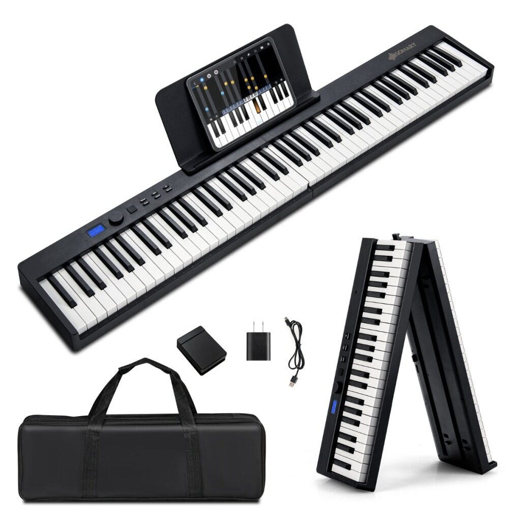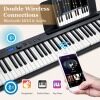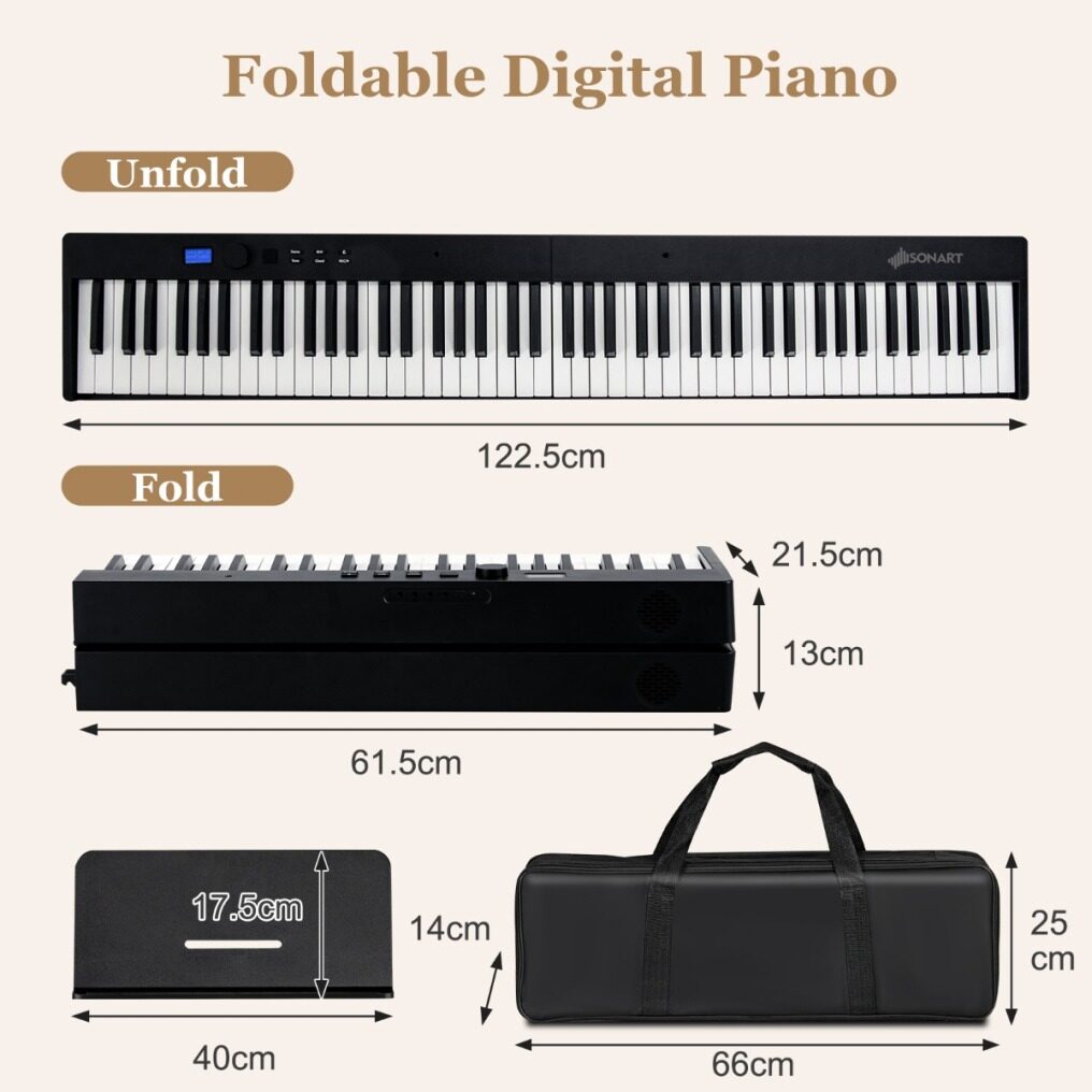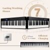 Foldable Keyboard with Rechargeable Battery: This portable piano easily folds out 180°in a backpack size after releasing the button lock for more flexible use, which redefines the portable piano. And it weighs only 10.4 lbs to provide convenience and efficiency for travelling musical enthusiasts. It has a 7-hour battery life after a full charge.