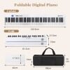 Foldable Keyboard with Rechargeable Battery: This portable piano easily folds out 180°in a backpack size after releasing the button lock for more flexible use, which redefines the portable piano. And it weighs only 10.4 lbs to provide convenience and efficiency for travelling musical enthusiasts. It has a 7-hour battery life after a full charge.