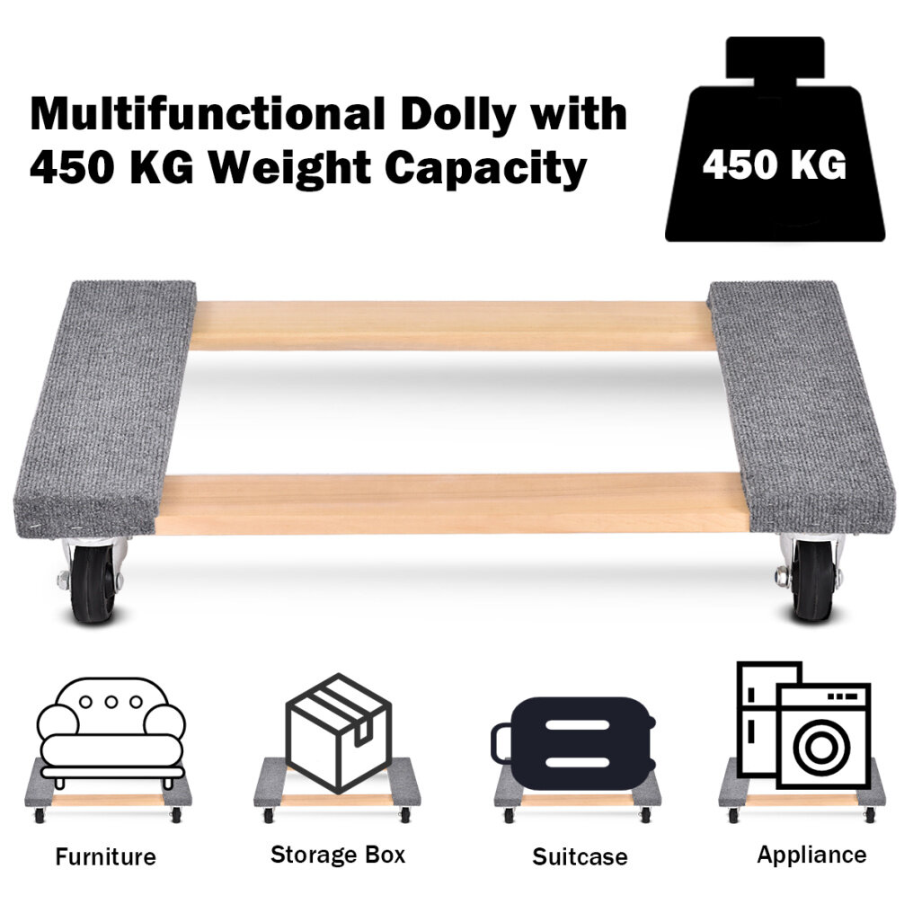The furniture dolly helps you get tough jobs done quickly and with ease. This rolling dolly is ideal for moving furniture, appliances, equipment and boxes at work or home. This sturdy mover can handle up to 450kg and the non-slip pads help keep your valuables from moving or shifting. This all-purpose moving dolly is a versatile material-handling tool for any home, shop or professional garage!