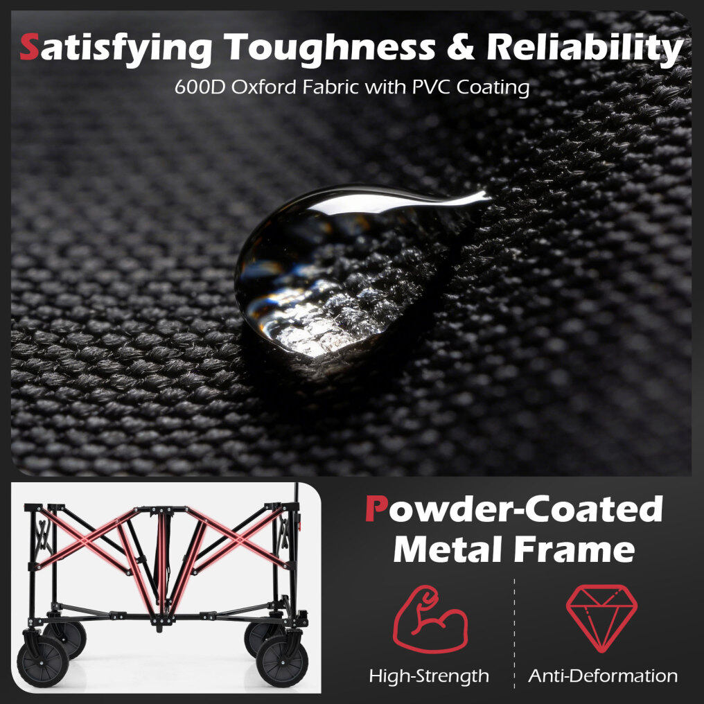 ● Heavy-Duty Strength: This collapsible wagon features a robust powder-coated metal frame supporting up to 400 lbs, which offers exceptional strength for heavy-duty use. Featuring 600D Oxford fabric with PVC coating, it also ensures long-lasting durability.